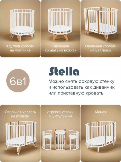 Кроватка-трансформер Pituso Stella 6 в 1 с маятником 125*75 (овал) и 75*75 (круг) белый
