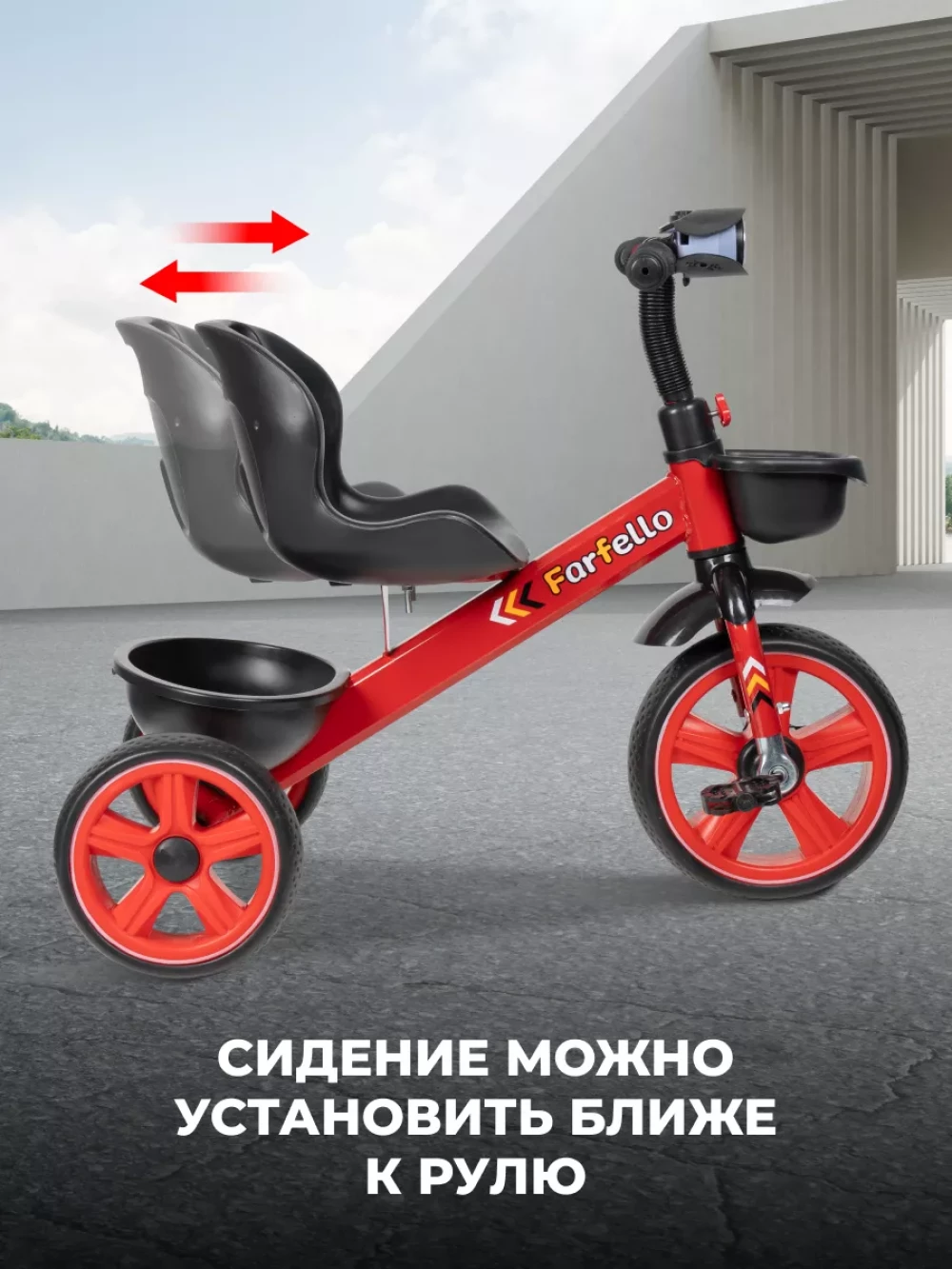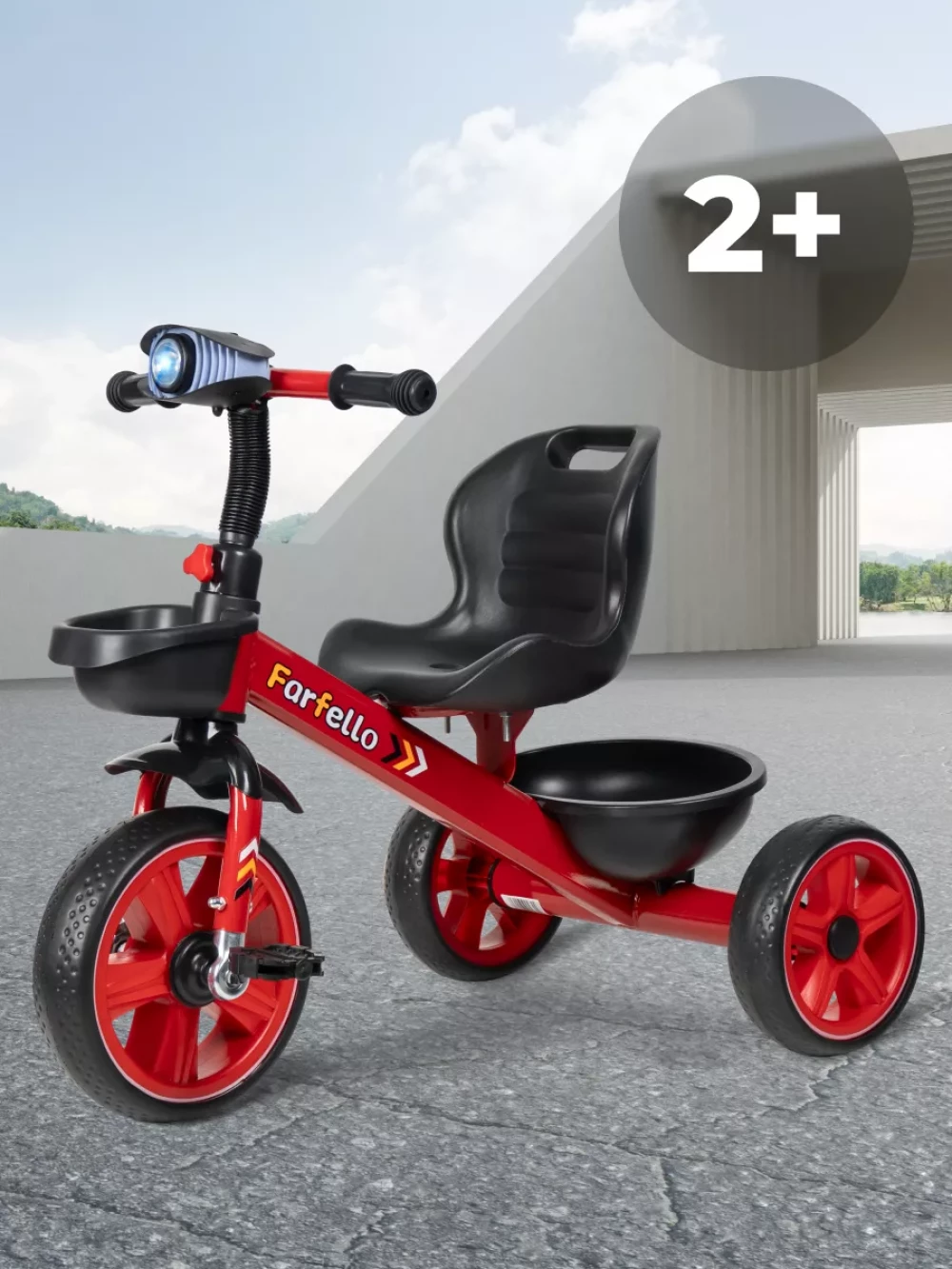 корзина для мелочей и корзина для игрушек; фонарь с музыкальной панелью; инструкция; рама, руль, колеса, сидение