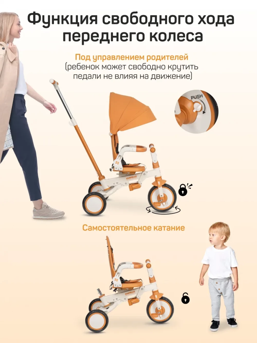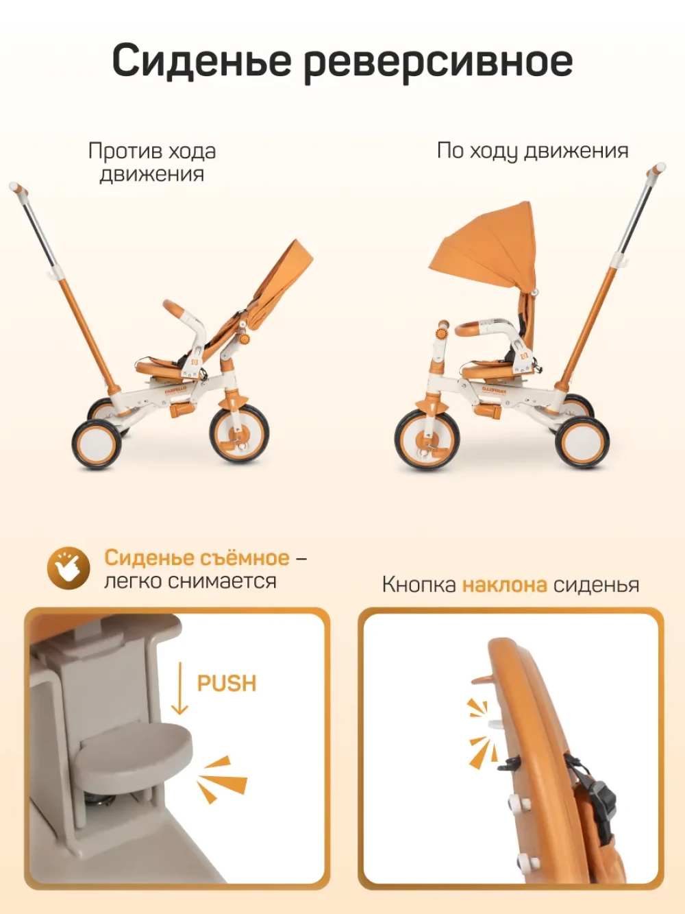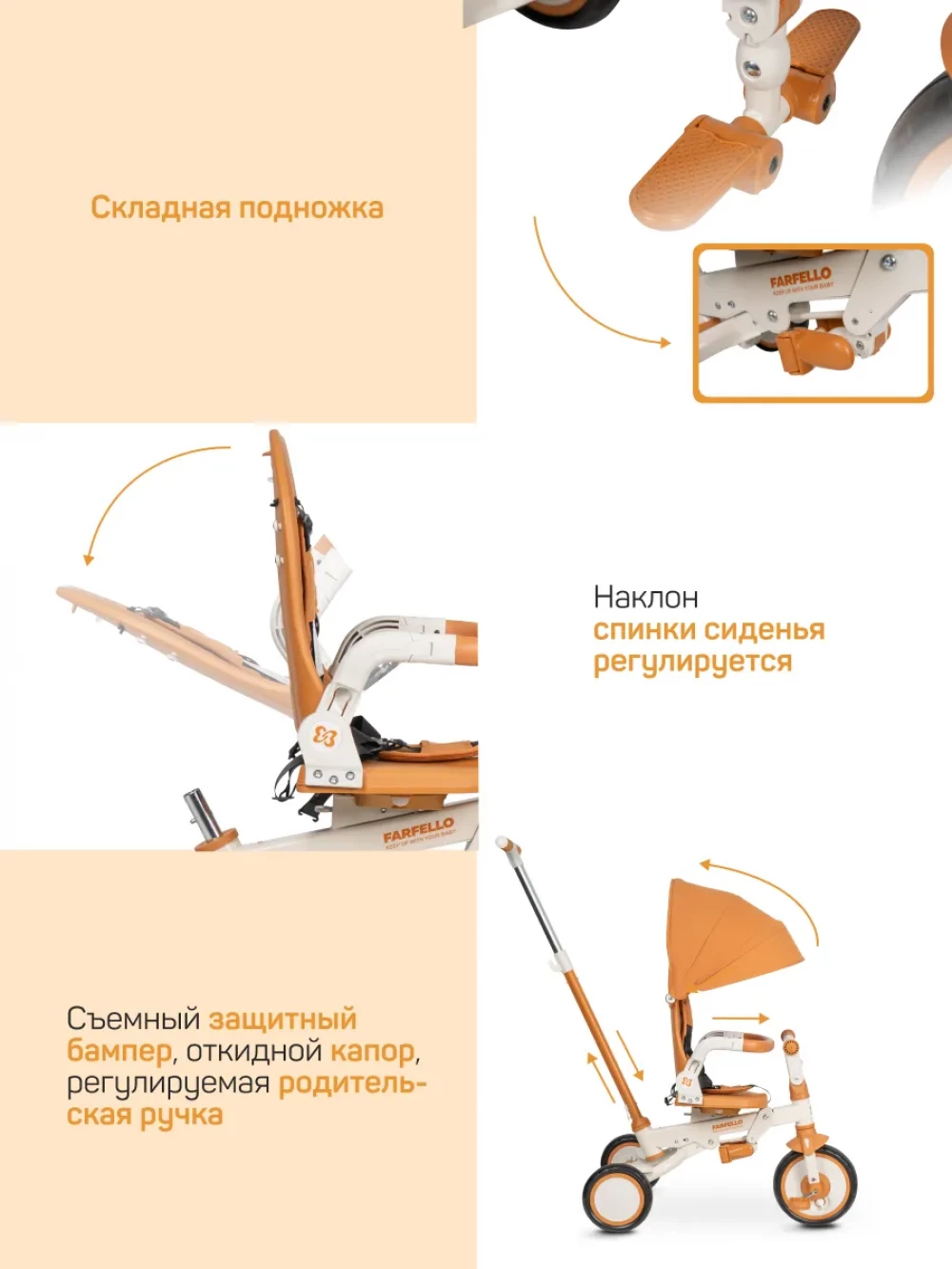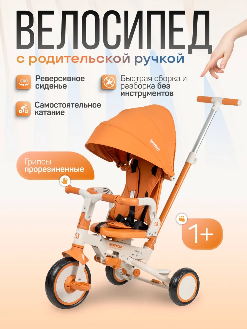 велосипед; родительская ручка; капор; бампер; подножка; пятиточечные ремни с мягкими плечевыми накладками; инструкция