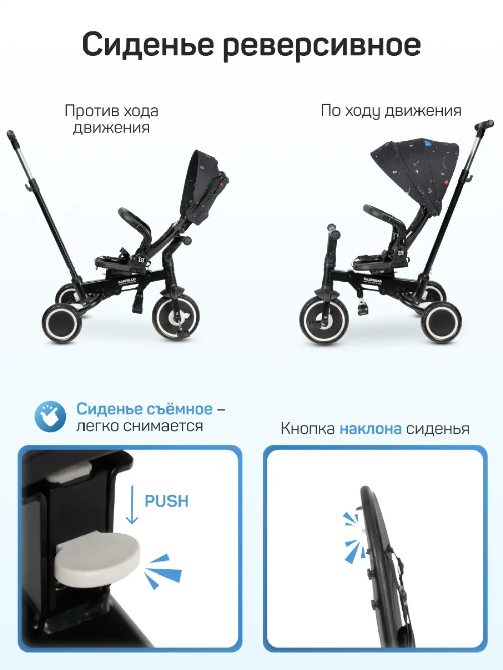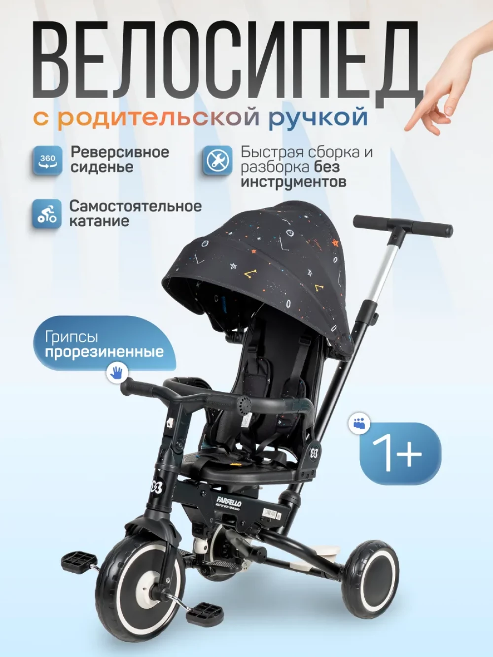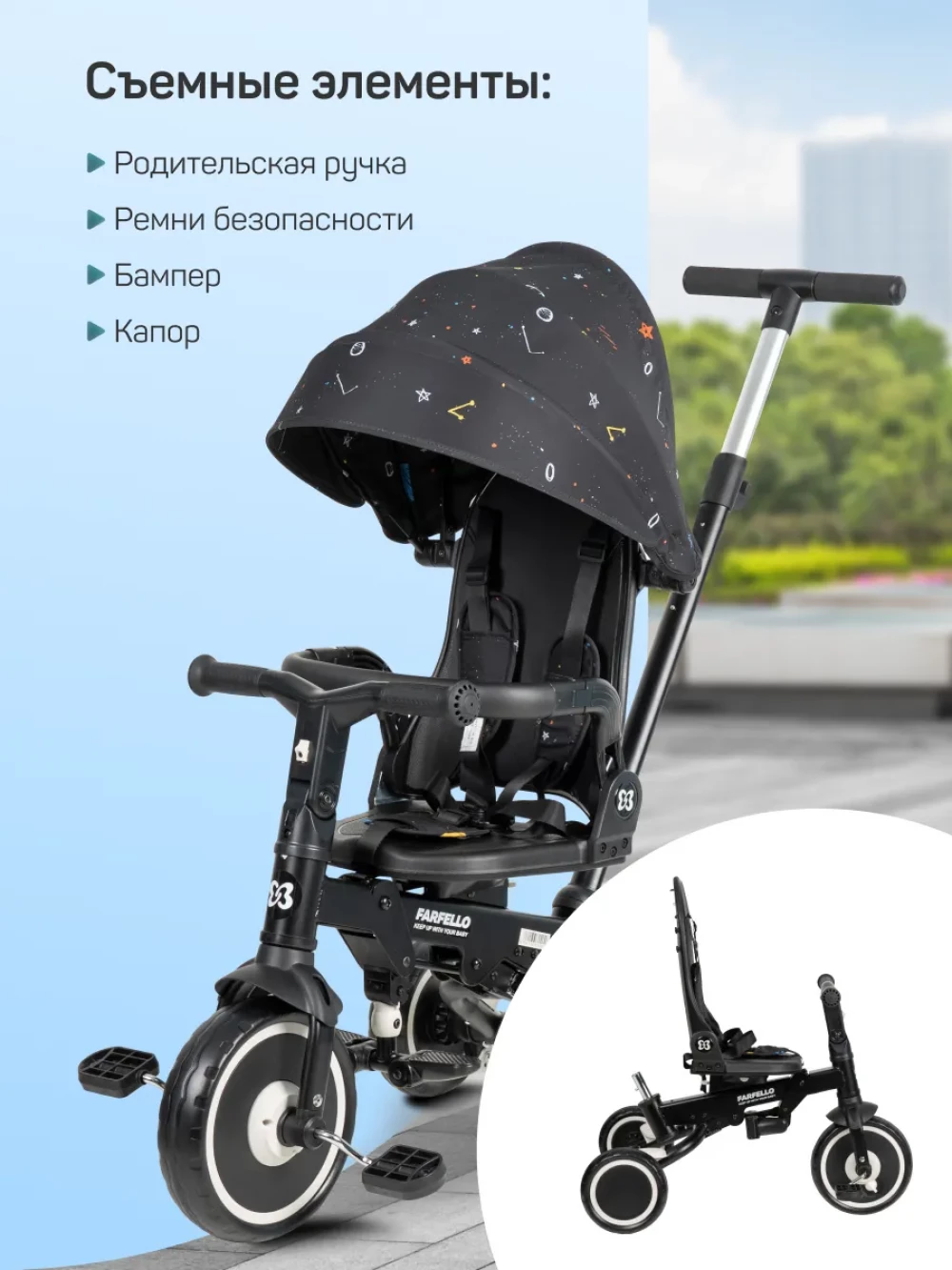 велосипед; родительская ручка; капор; бампер; подножка; пятиточечные ремни с мягкими плечевыми накладками; инструкция