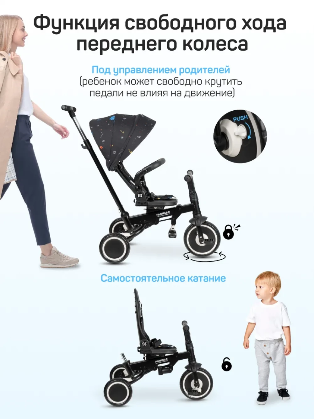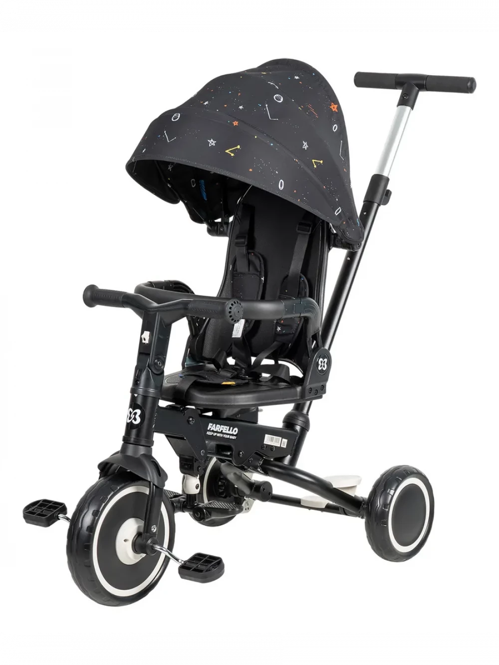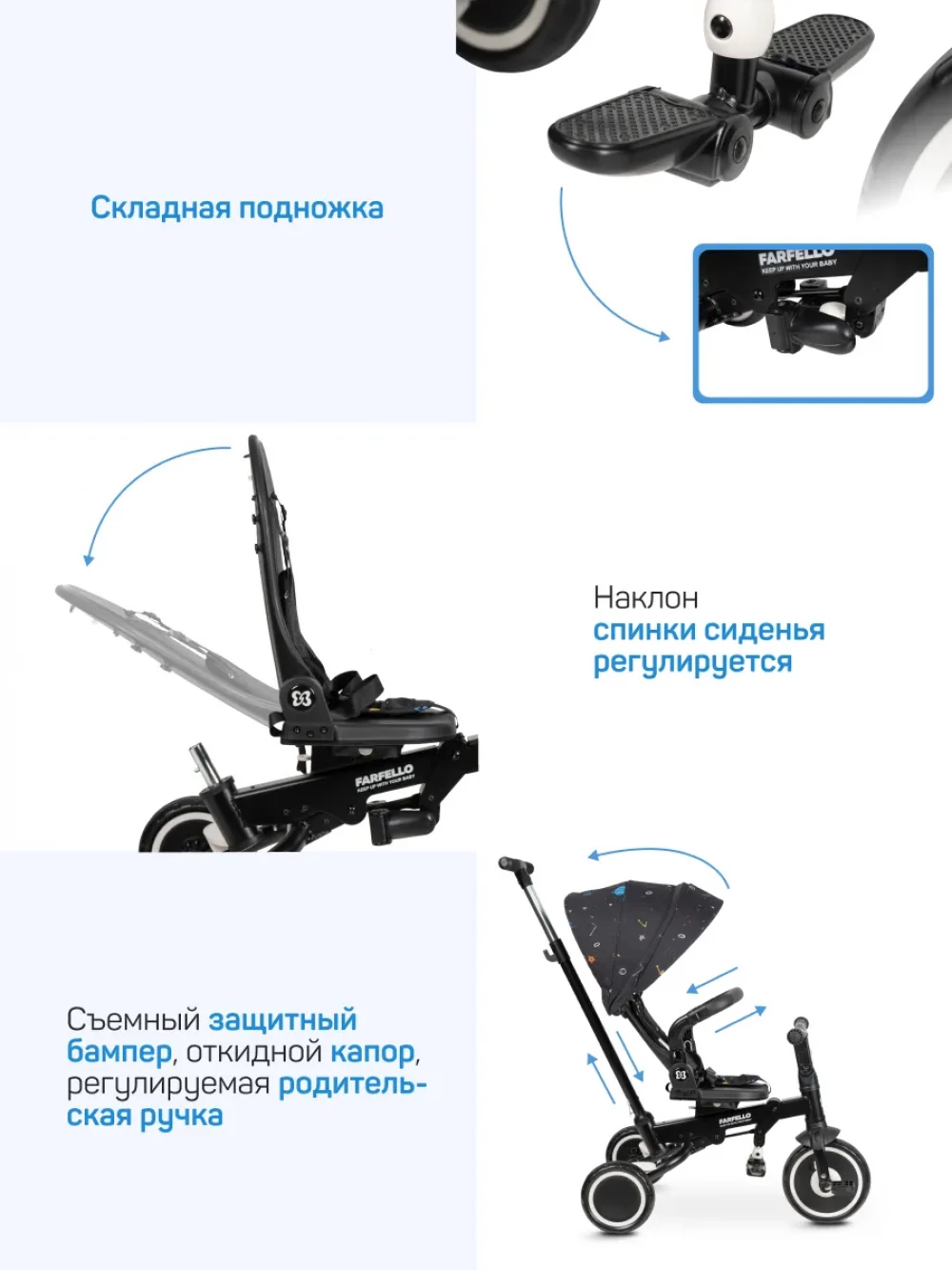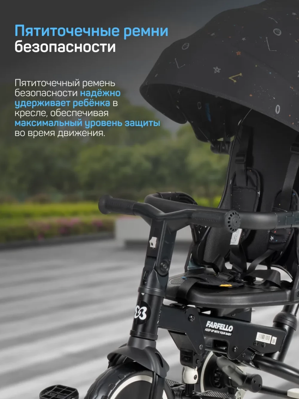 велосипед; родительская ручка; капор; бампер; подножка; пятиточечные ремни с мягкими плечевыми накладками; инструкция