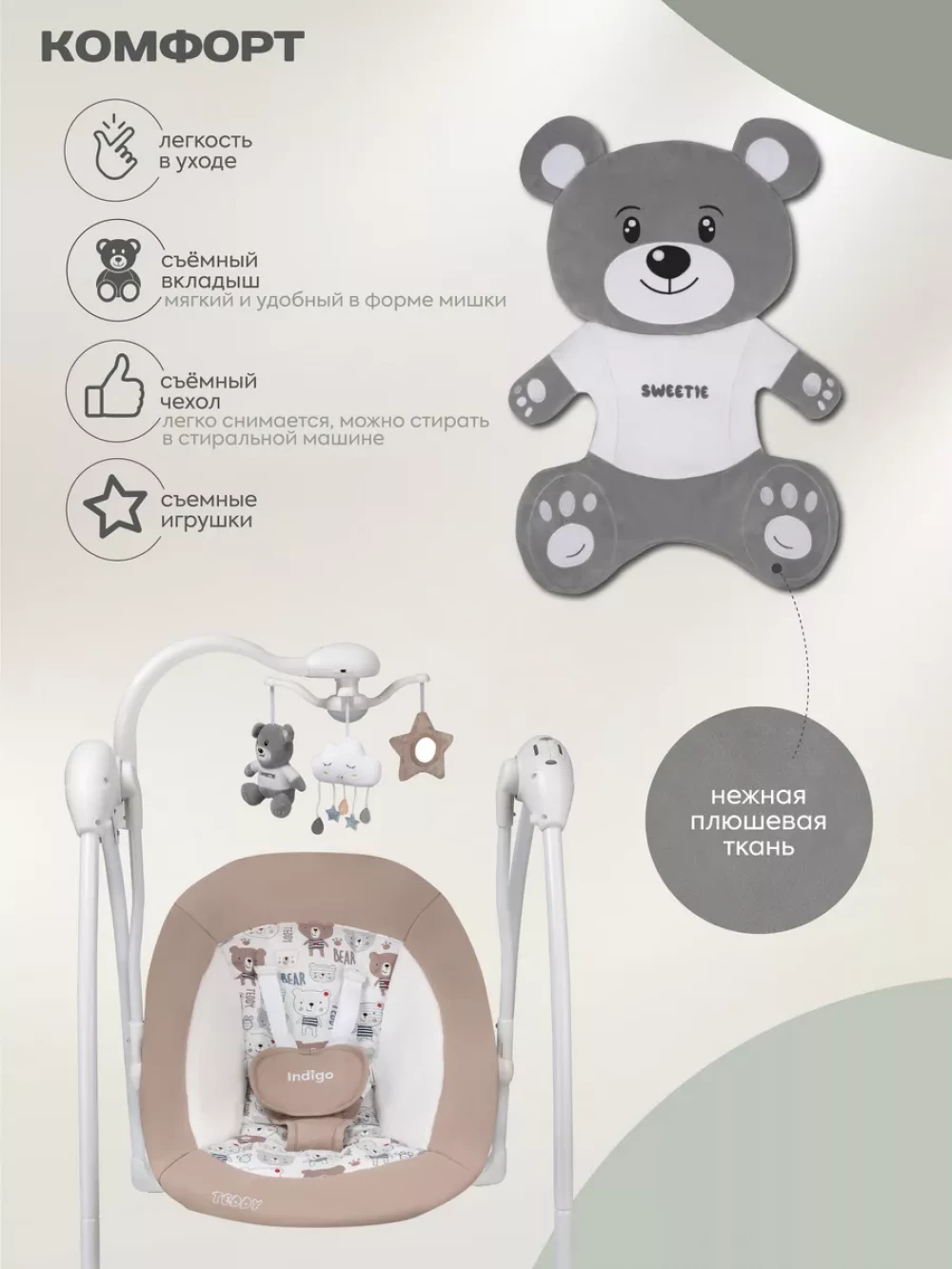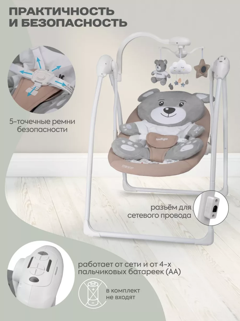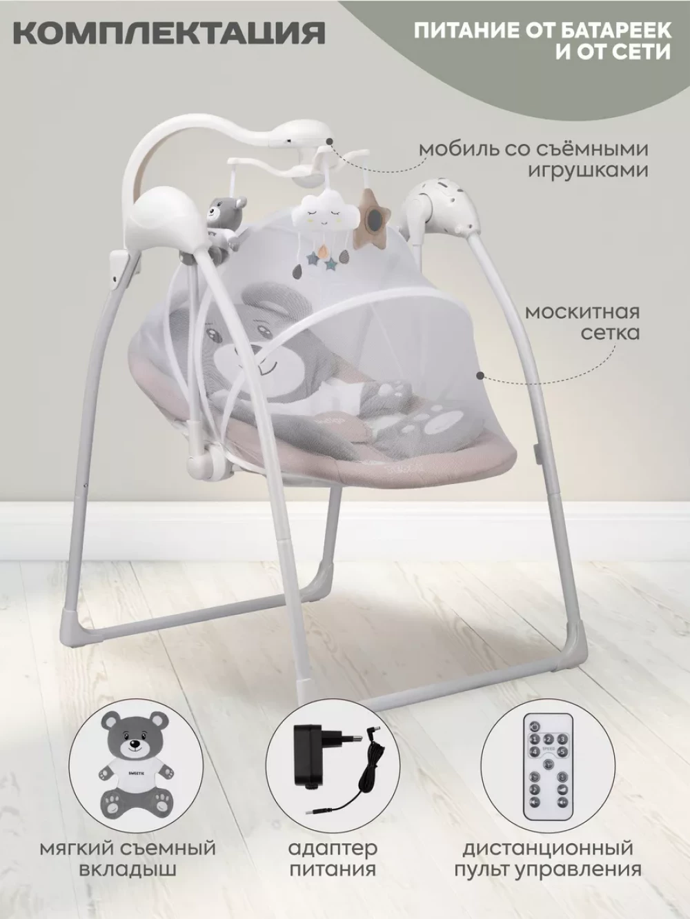 электрокачели; москитная сетка; блок питания; пульт управления; 3 игрушки; съемный мобиль; 5-ти точечные ремни безопасности