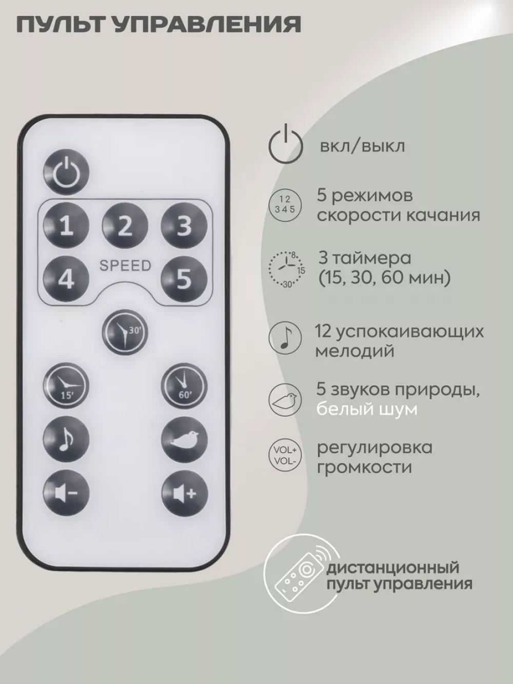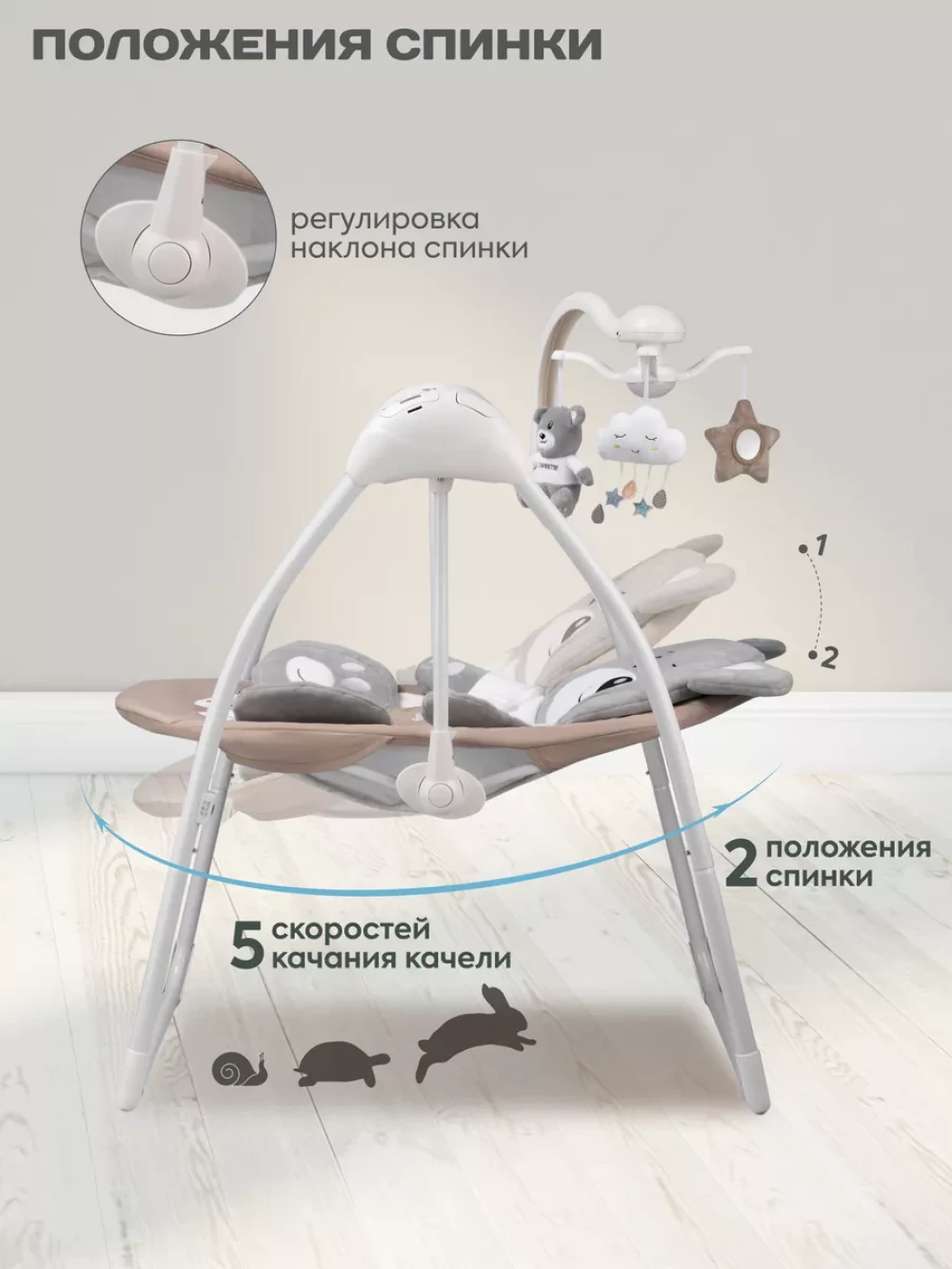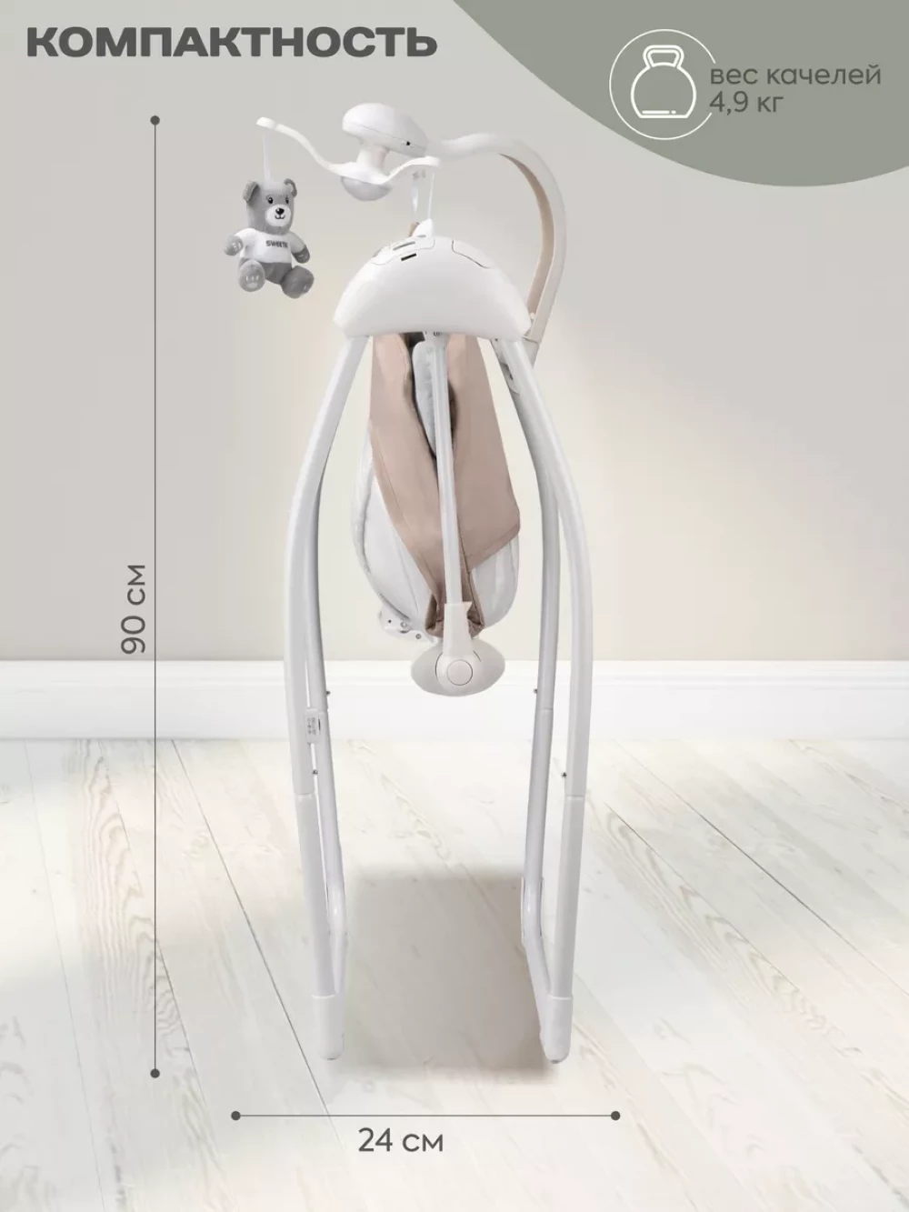 электрокачели; москитная сетка; блок питания; пульт управления; 3 игрушки; съемный мобиль; 5-ти точечные ремни безопасности