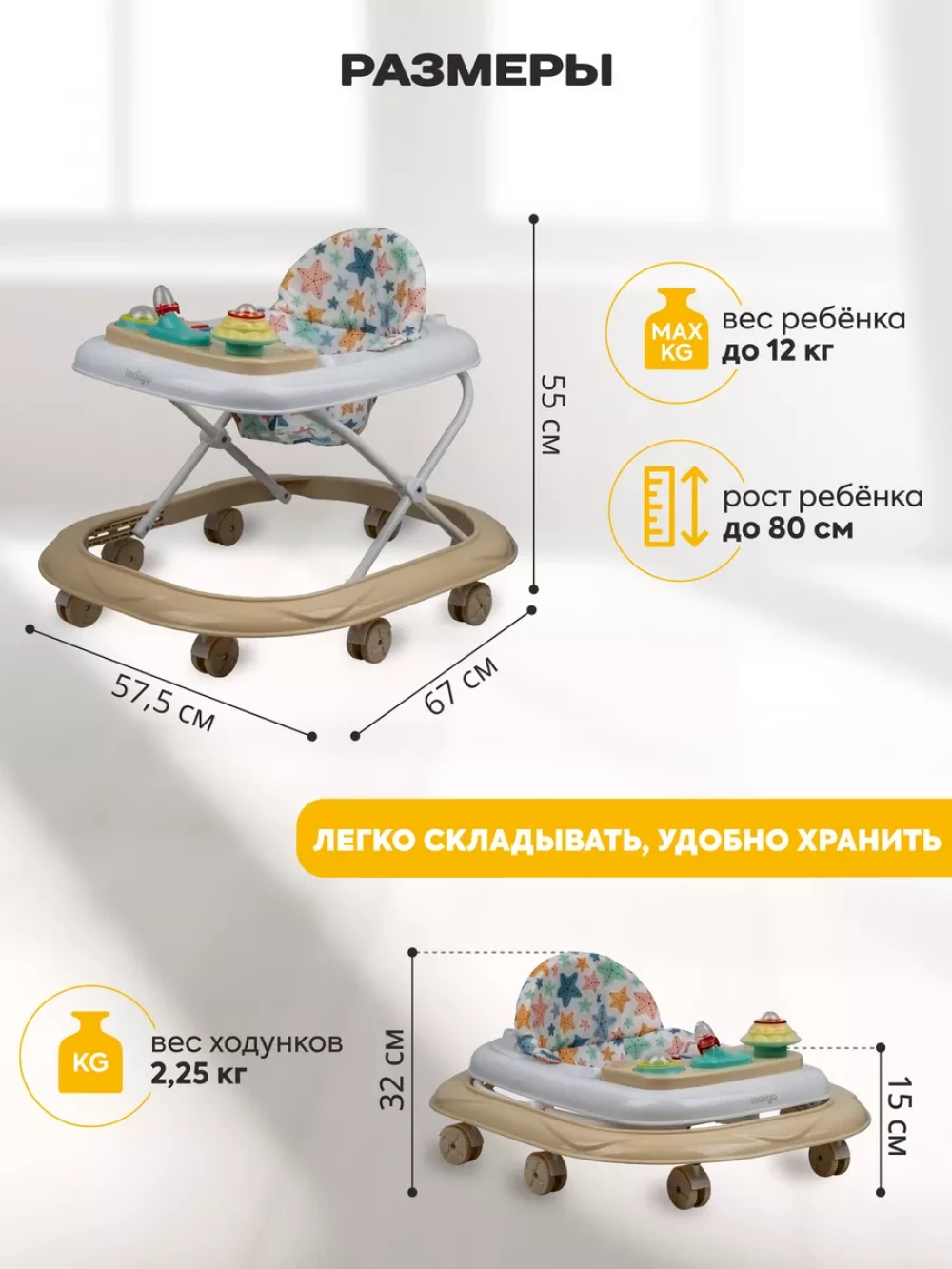 ходунки; 8 колес; сиденье с мягкой спинкой; игровая панель; инструкция