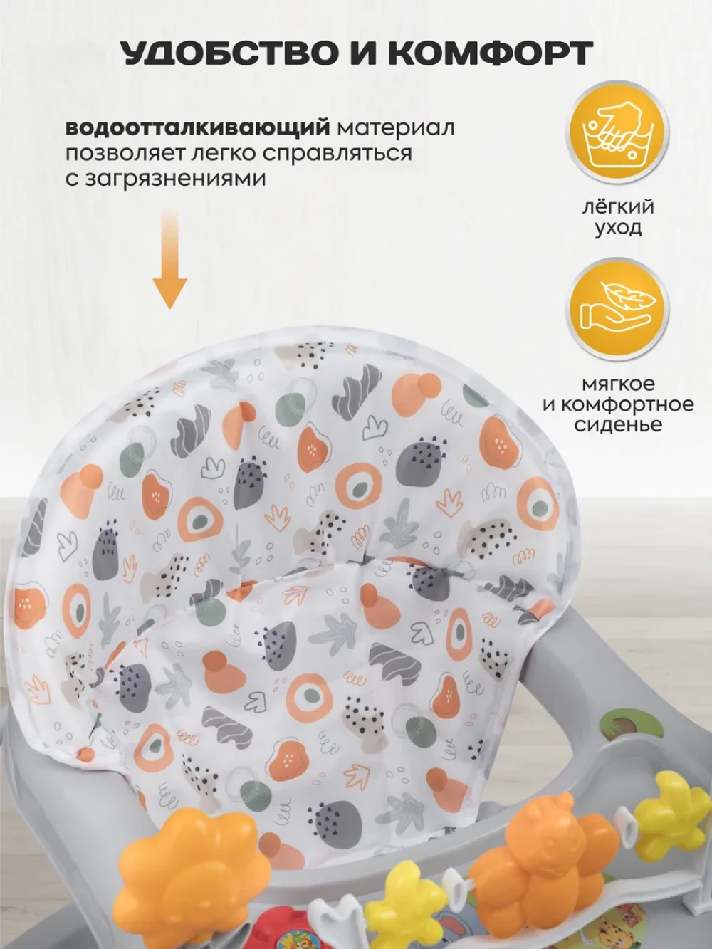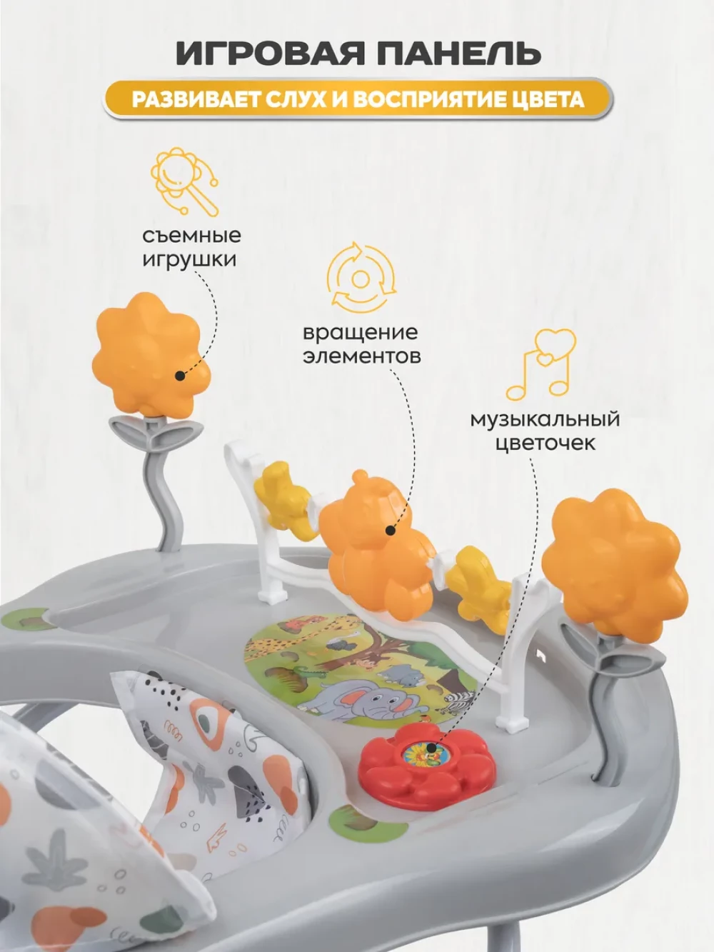 музыкальное сопровождение; регулировка высоты сиденья; съемная игровая панель