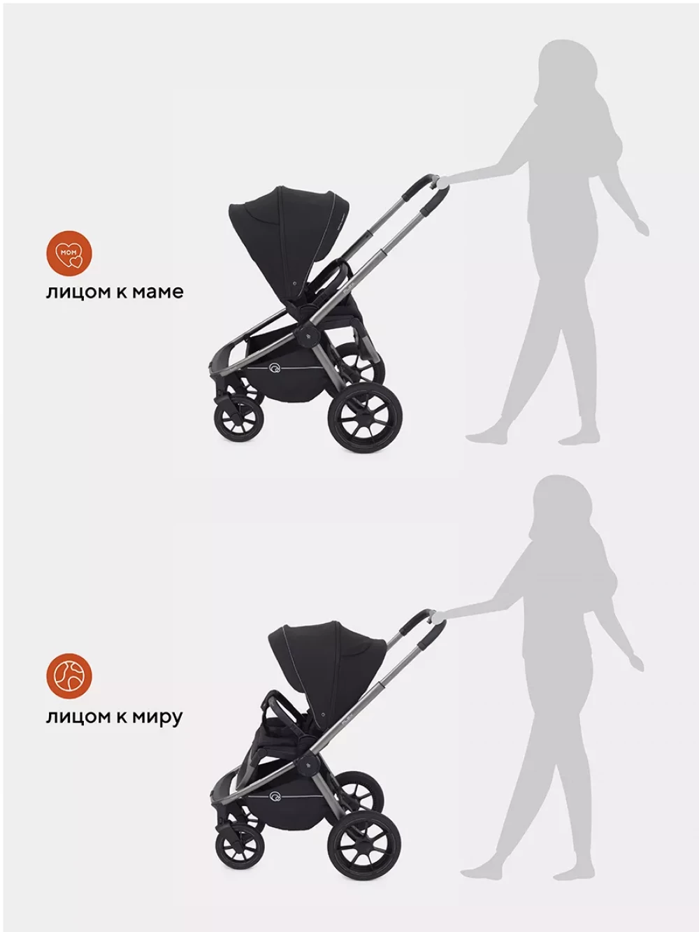 Передние колеса поворотные с блокировкой; прогулочный блок реверсивный; телескопическая ручка