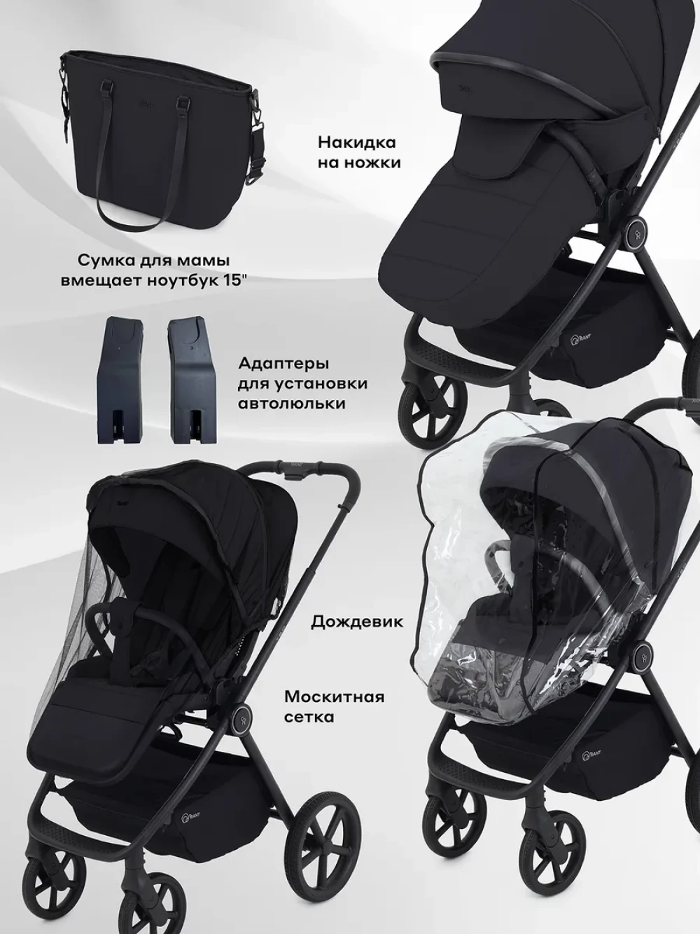 шасси; люлька; прогулочный блок; адаптеры для автолюльки; корзина для покупок; накидка на ножки; сумка; москитная сетка; дождевик