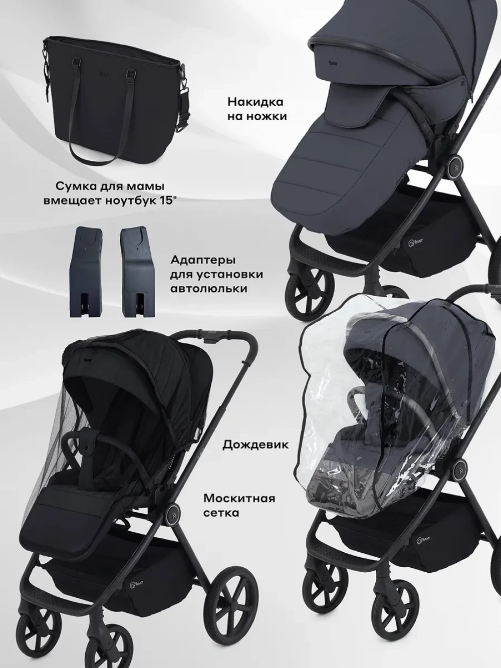 шасси; люлька; прогулочный блок; адаптеры для автолюльки; корзина для покупок; накидка на ножки; сумка; москитная сетка; дождевик