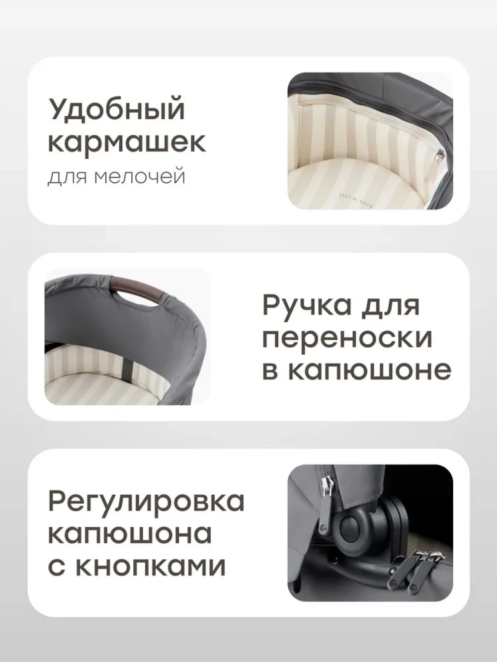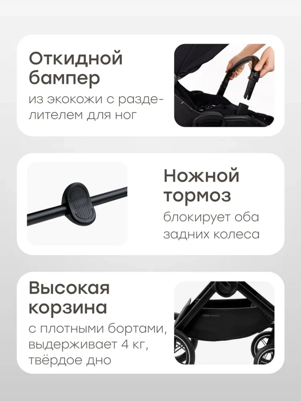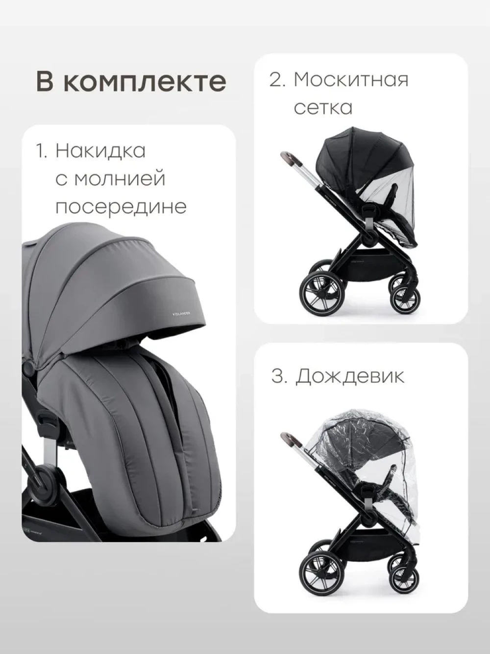 Вентилируемое окошко, Дождевик, Козырек от солнца, Москитная сетка, Ремни безопасности, Ручка для переноски, Разная ширина осей
