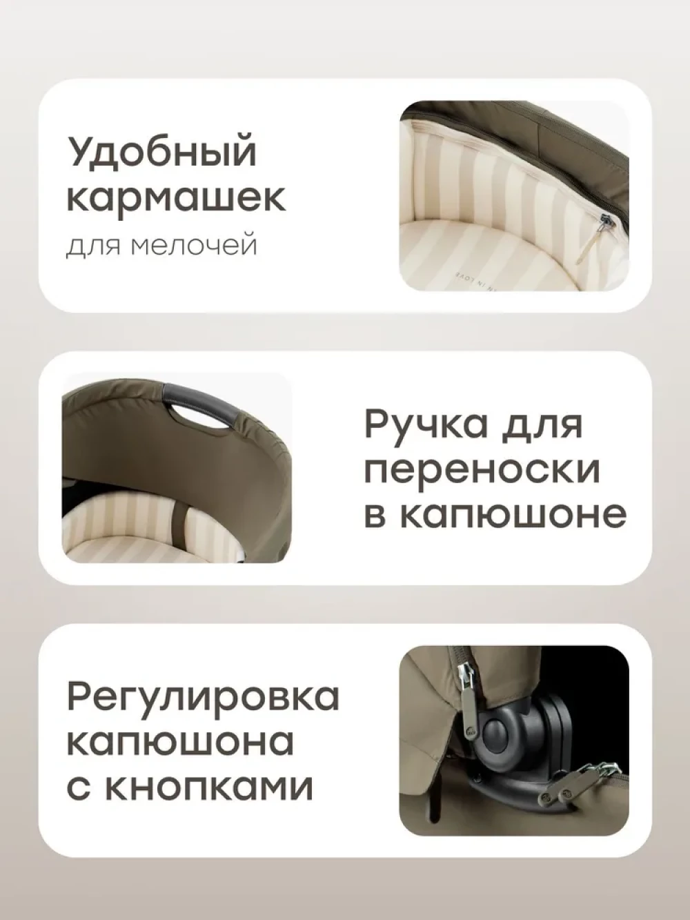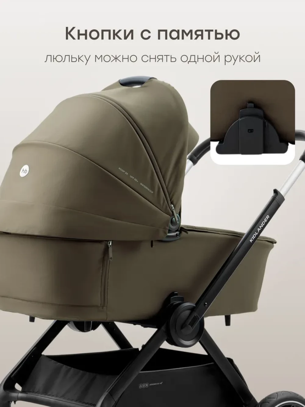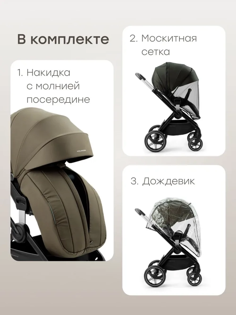 Вентилируемое окошко, Дождевик, Козырек от солнца, Москитная сетка, Ремни безопасности, Ручка для переноски, Разная ширина осей