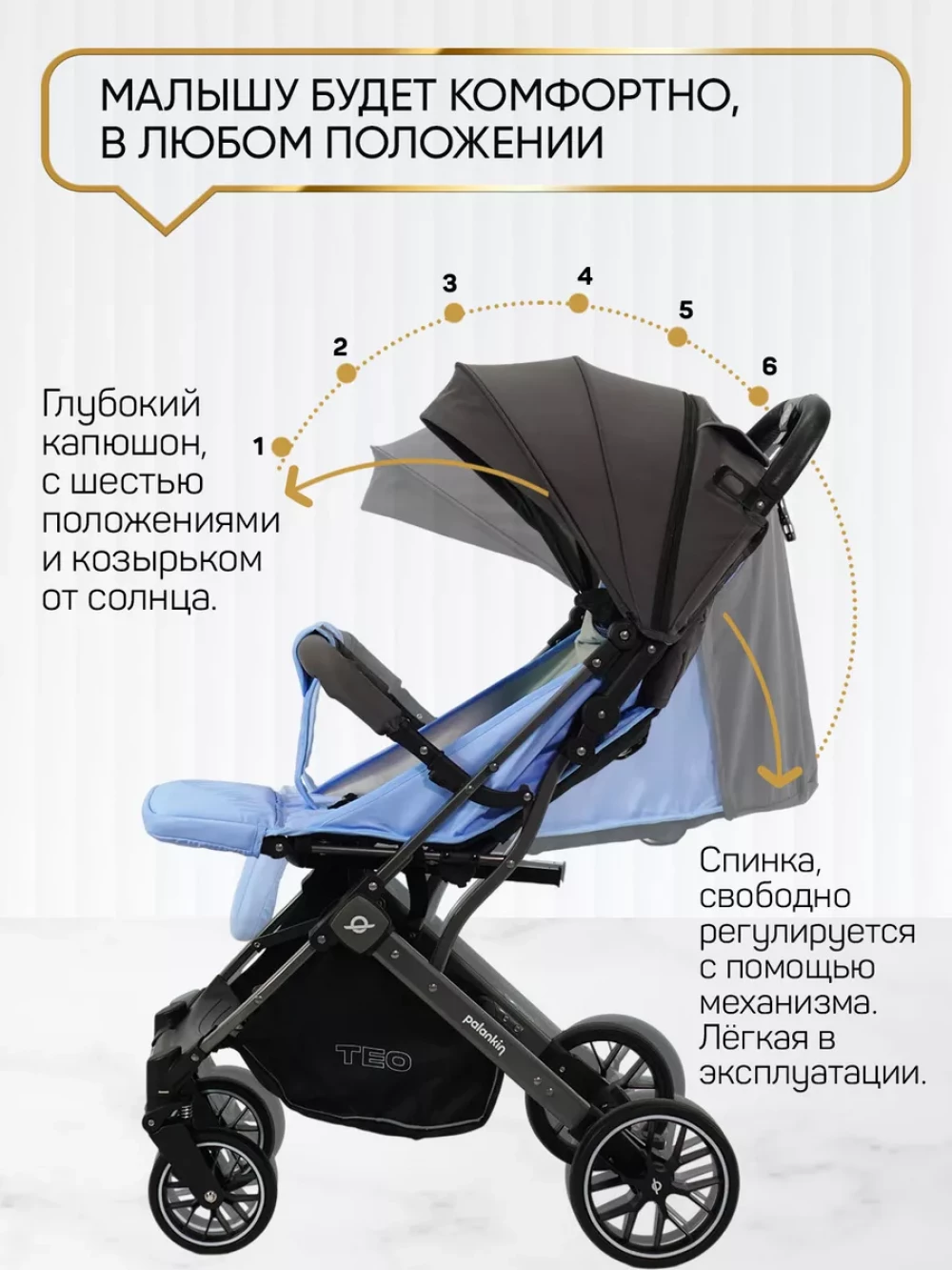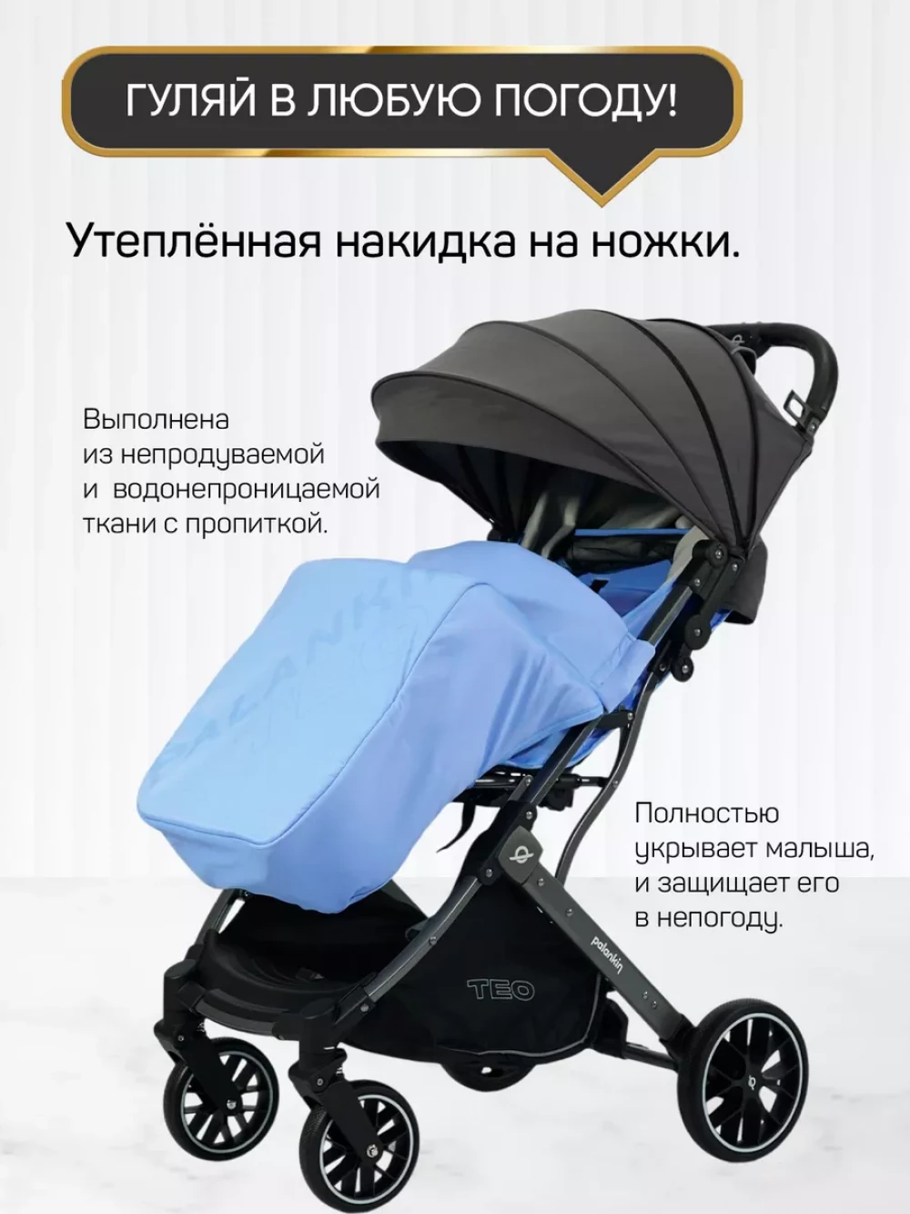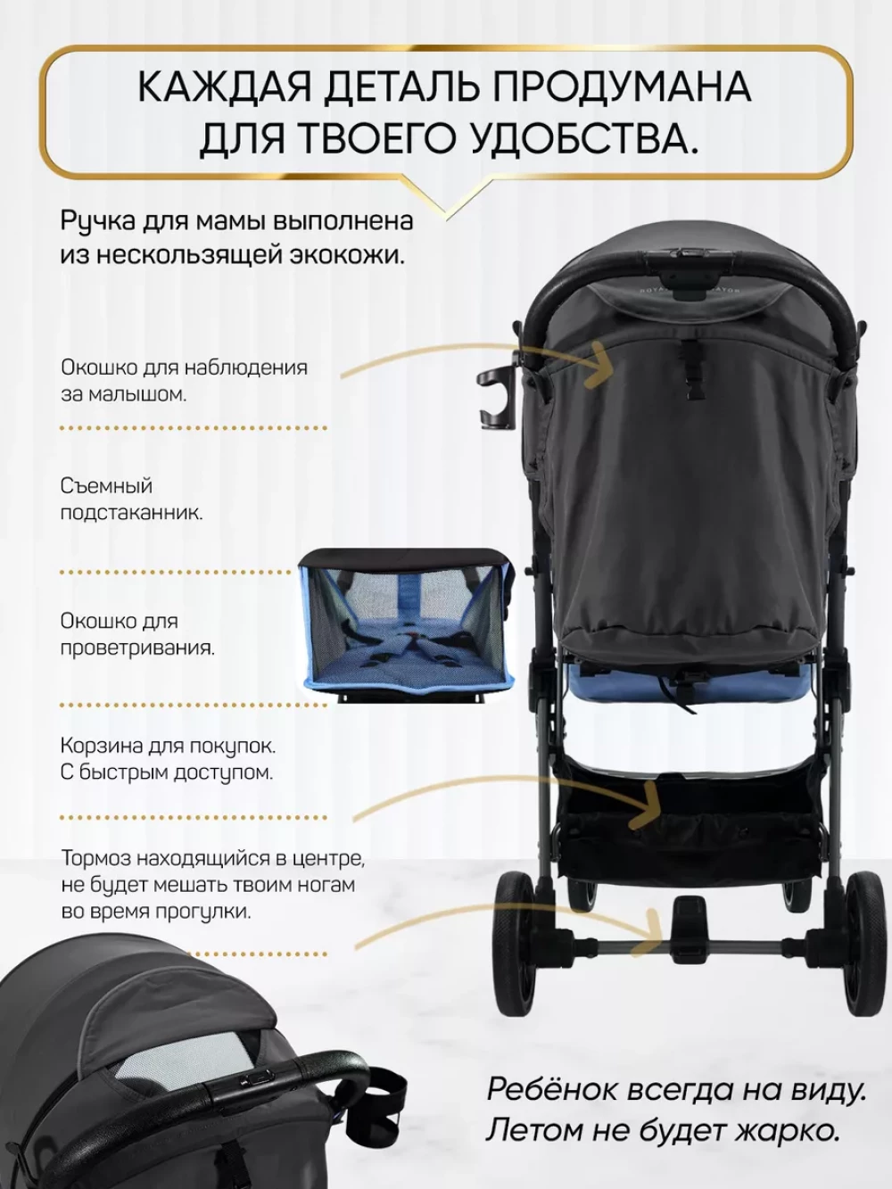 утепленная накидка на ножки; съемный подстаканник; вместительная корзина для покупок; москитная сетка; дождевик; чехол для транспортировки
