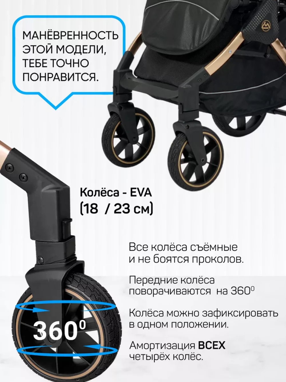 поворотные передние колеса; регулируемая спинка; с увеличенными колесами