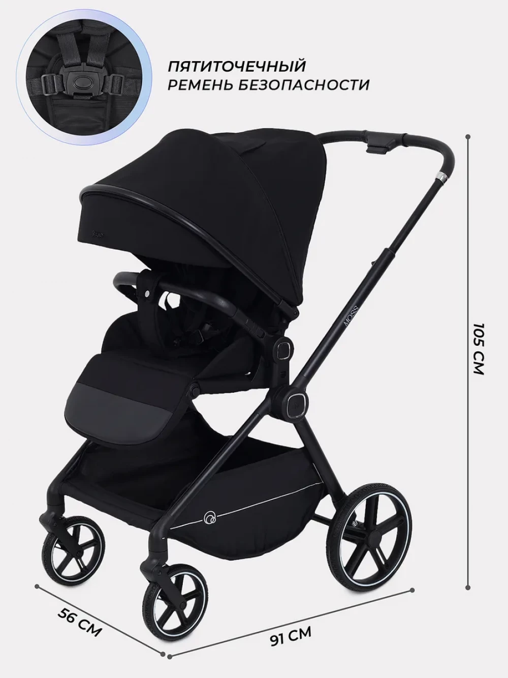 поворотные передние колеса; пятиточечные ремни безопасности; фиксация передних колес