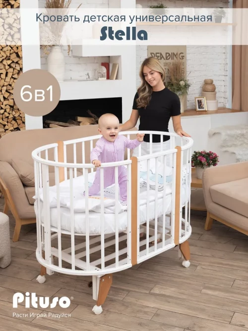 Кроватка-трансформер Pituso Stella 6 в 1 с маятником 125*75 (овал) и 75*75 (круг) белый