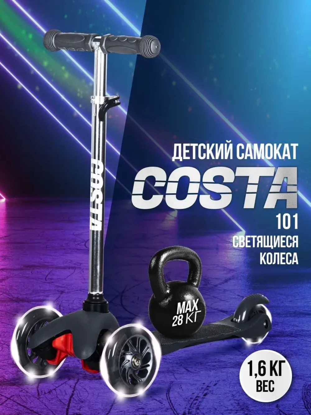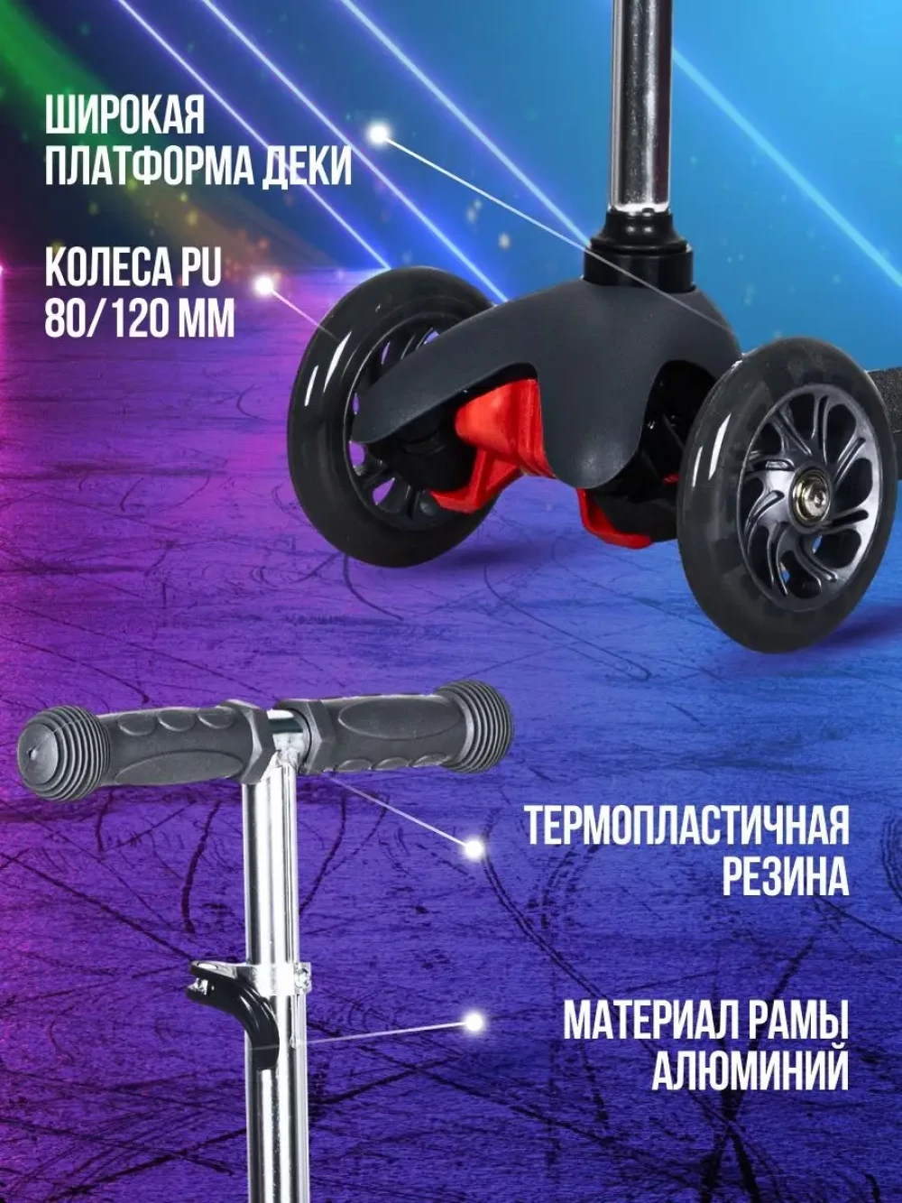 колеса светящиеся; противоскользящее покрытие деки; регулировка высоты руля