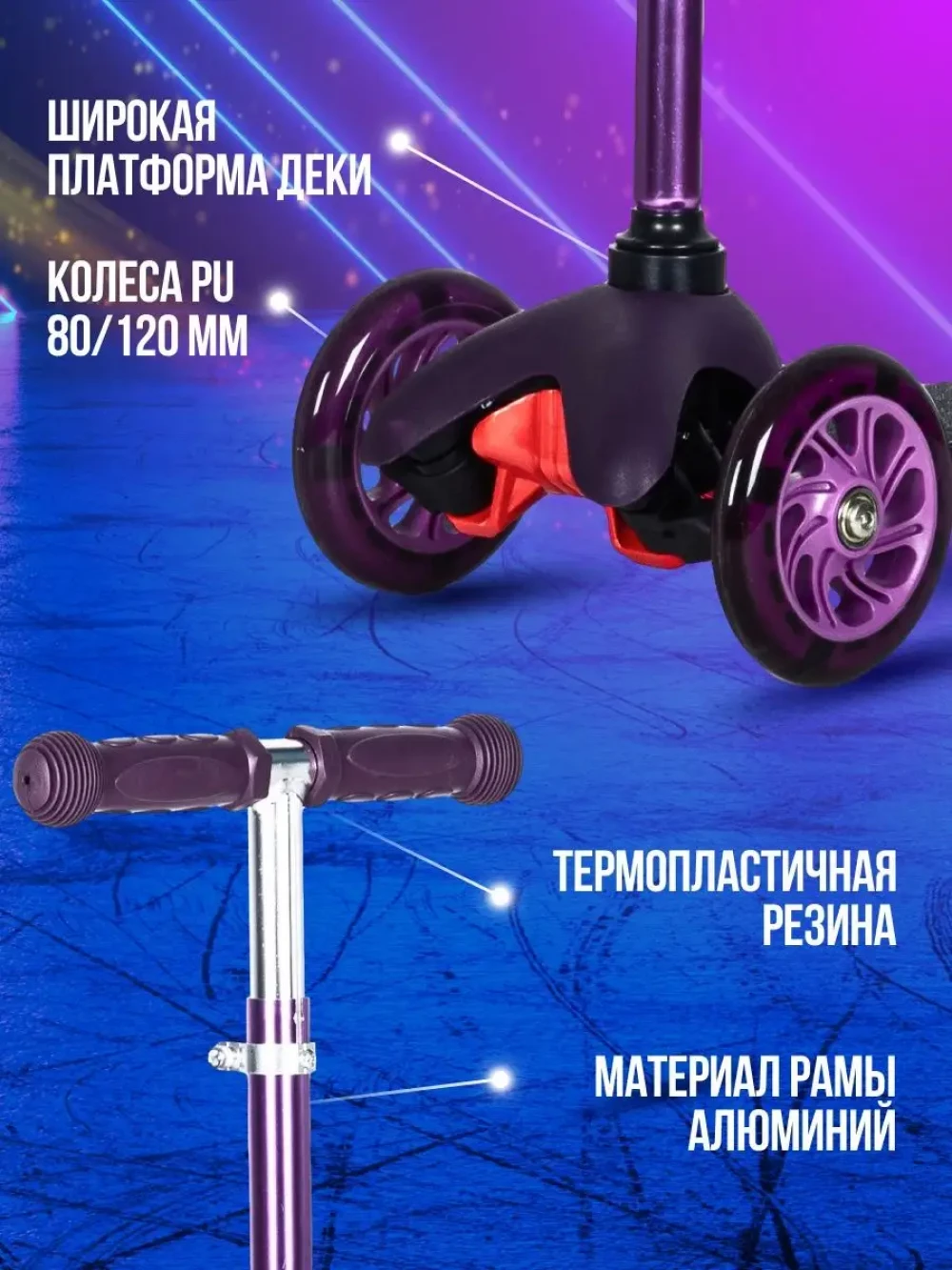 колеса светящиеся; противоскользящее покрытие деки; регулировка высоты руля