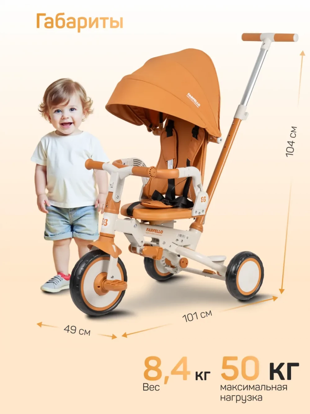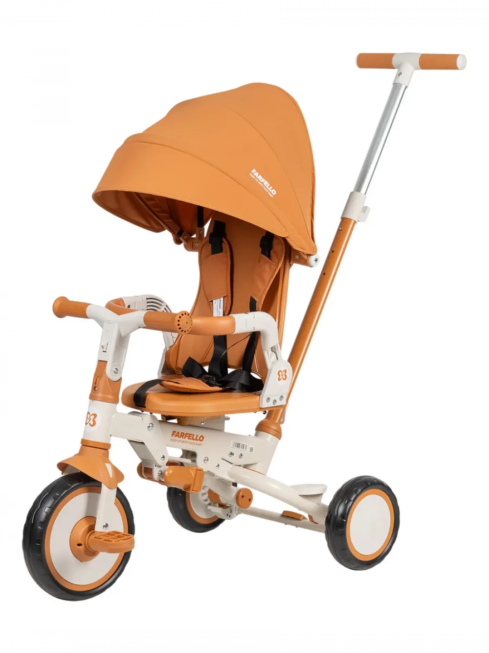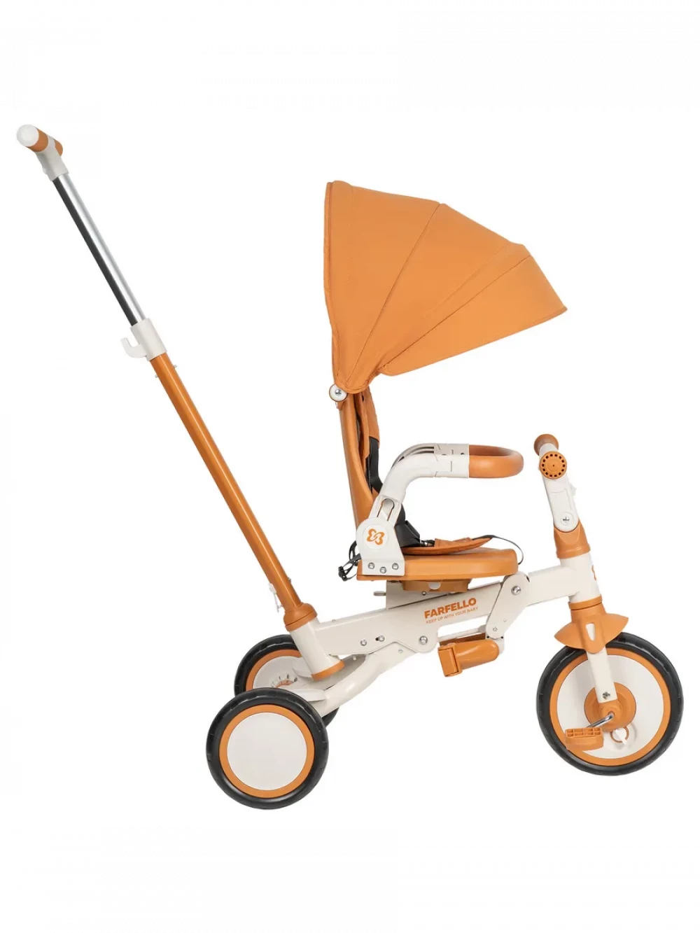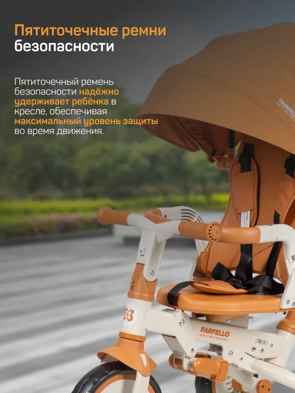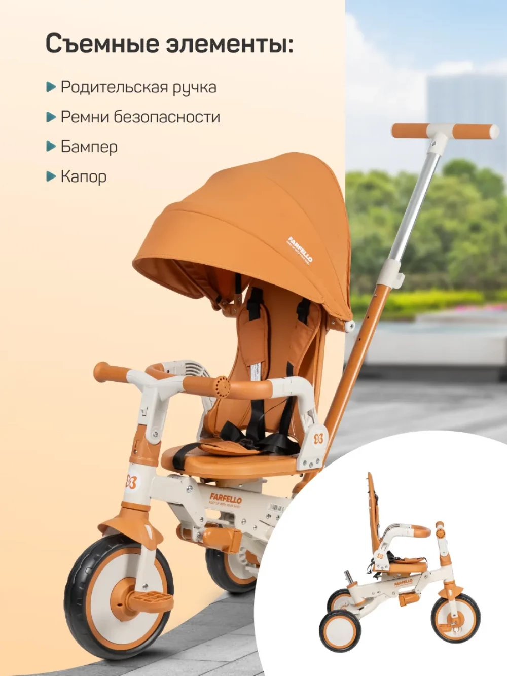 велосипед; родительская ручка; капор; бампер; подножка; пятиточечные ремни с мягкими плечевыми накладками; инструкция