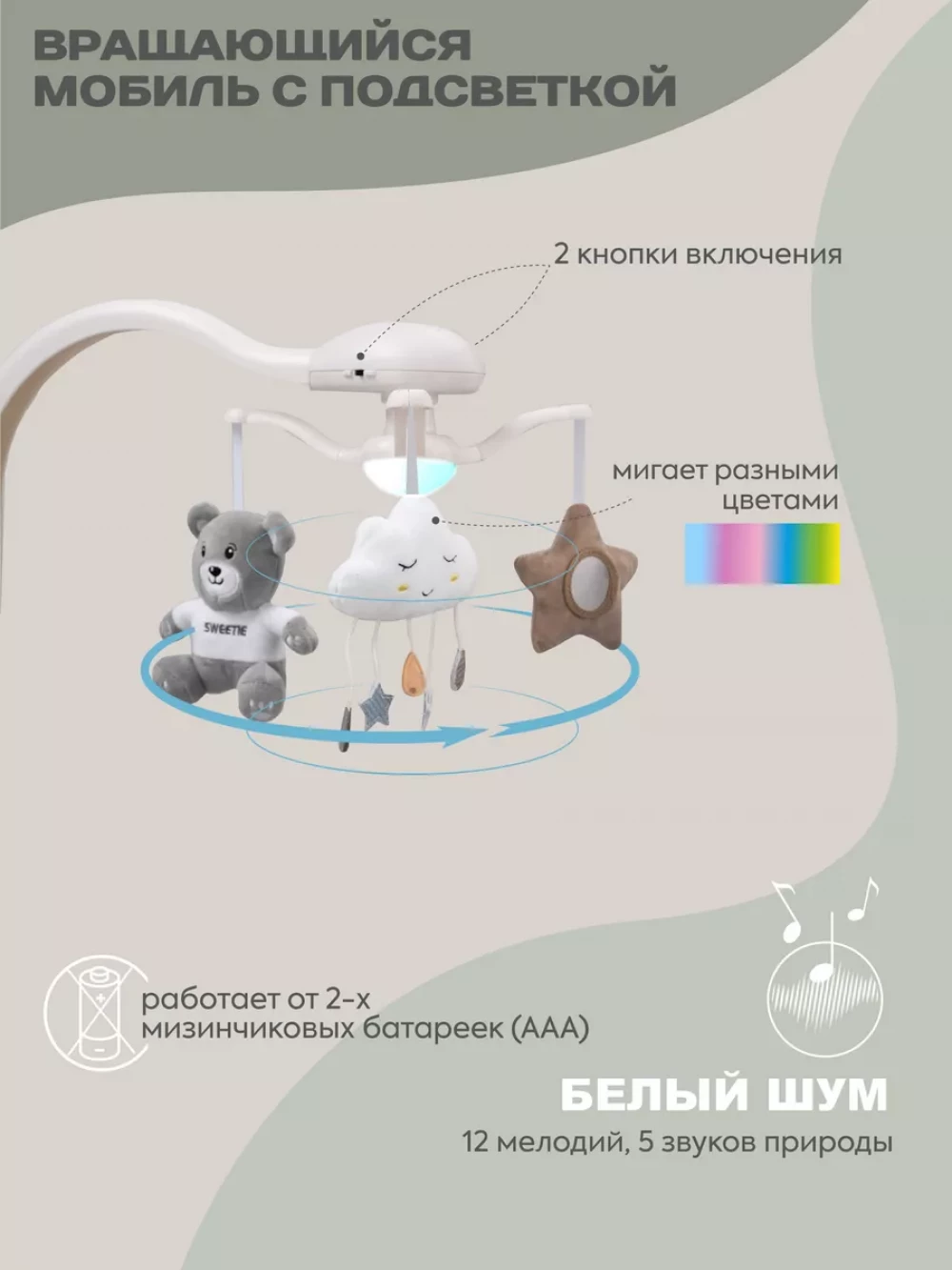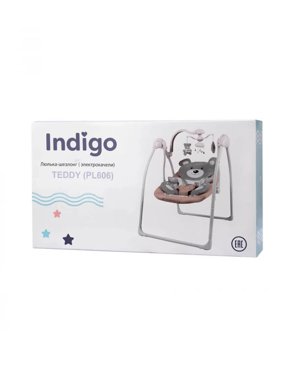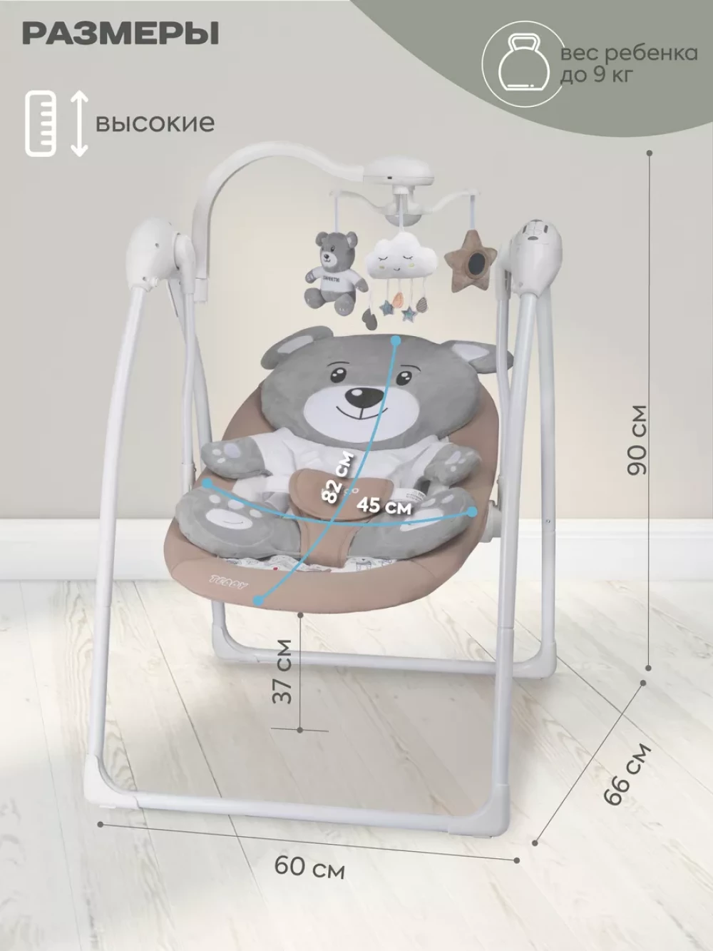 электрокачели; москитная сетка; блок питания; пульт управления; 3 игрушки; съемный мобиль; 5-ти точечные ремни безопасности