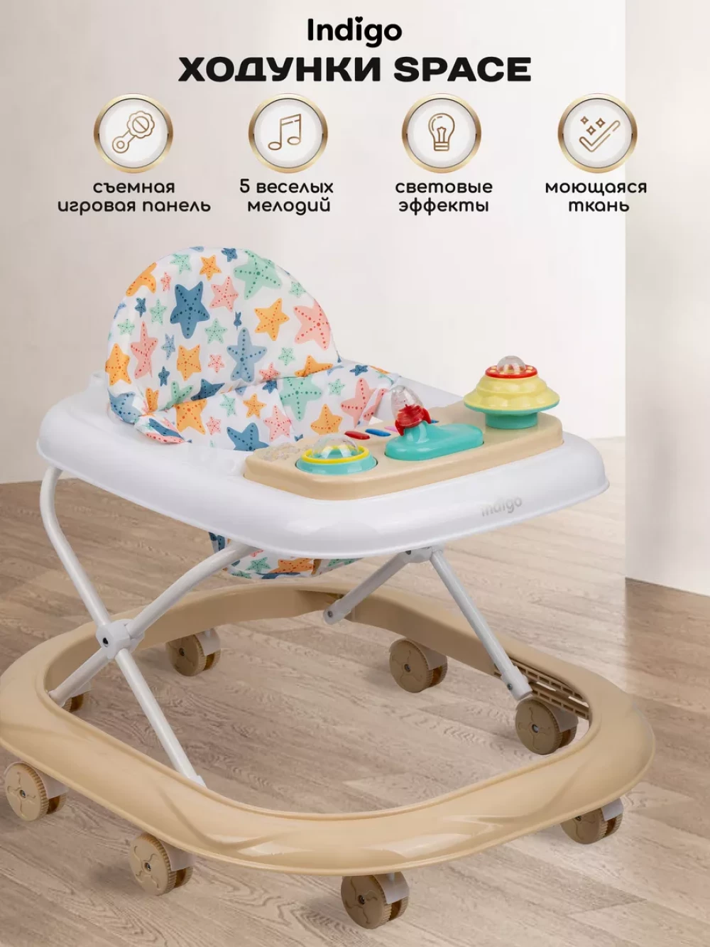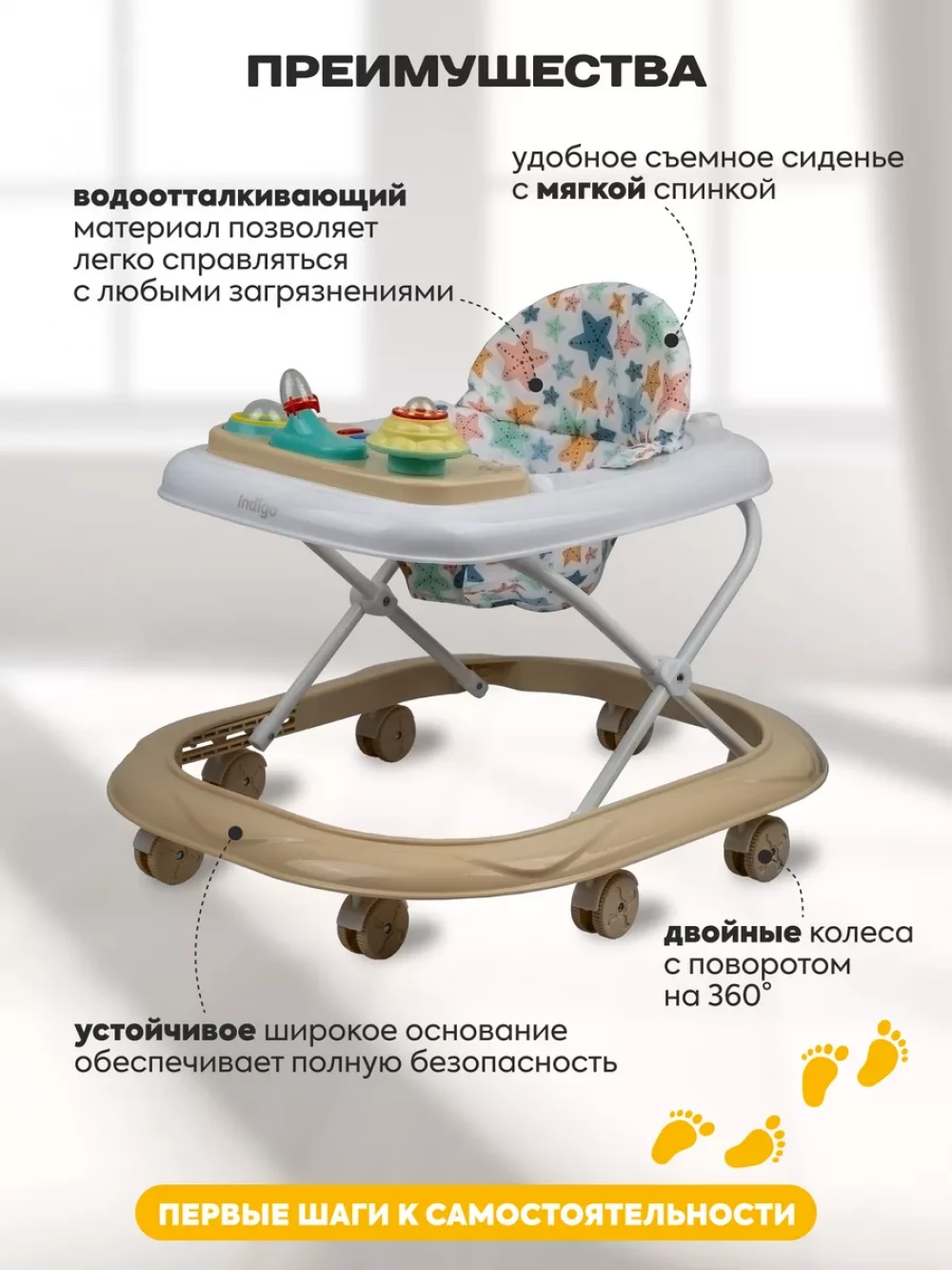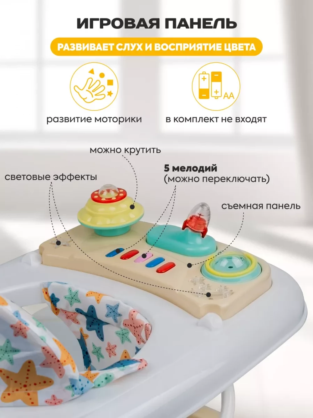 ходунки; 8 колес; сиденье с мягкой спинкой; игровая панель; инструкция