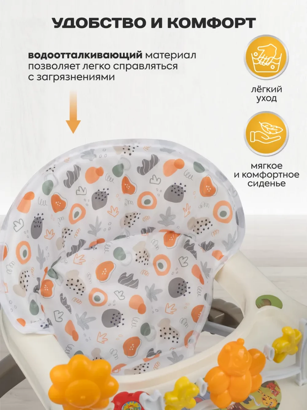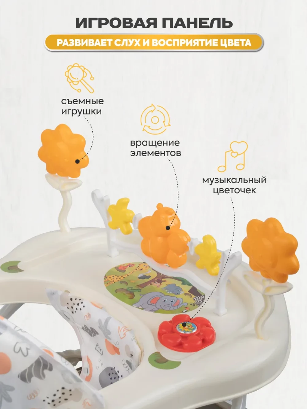 музыкальное сопровождение; регулировка высоты сиденья; съемная игровая панель