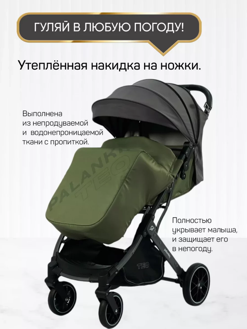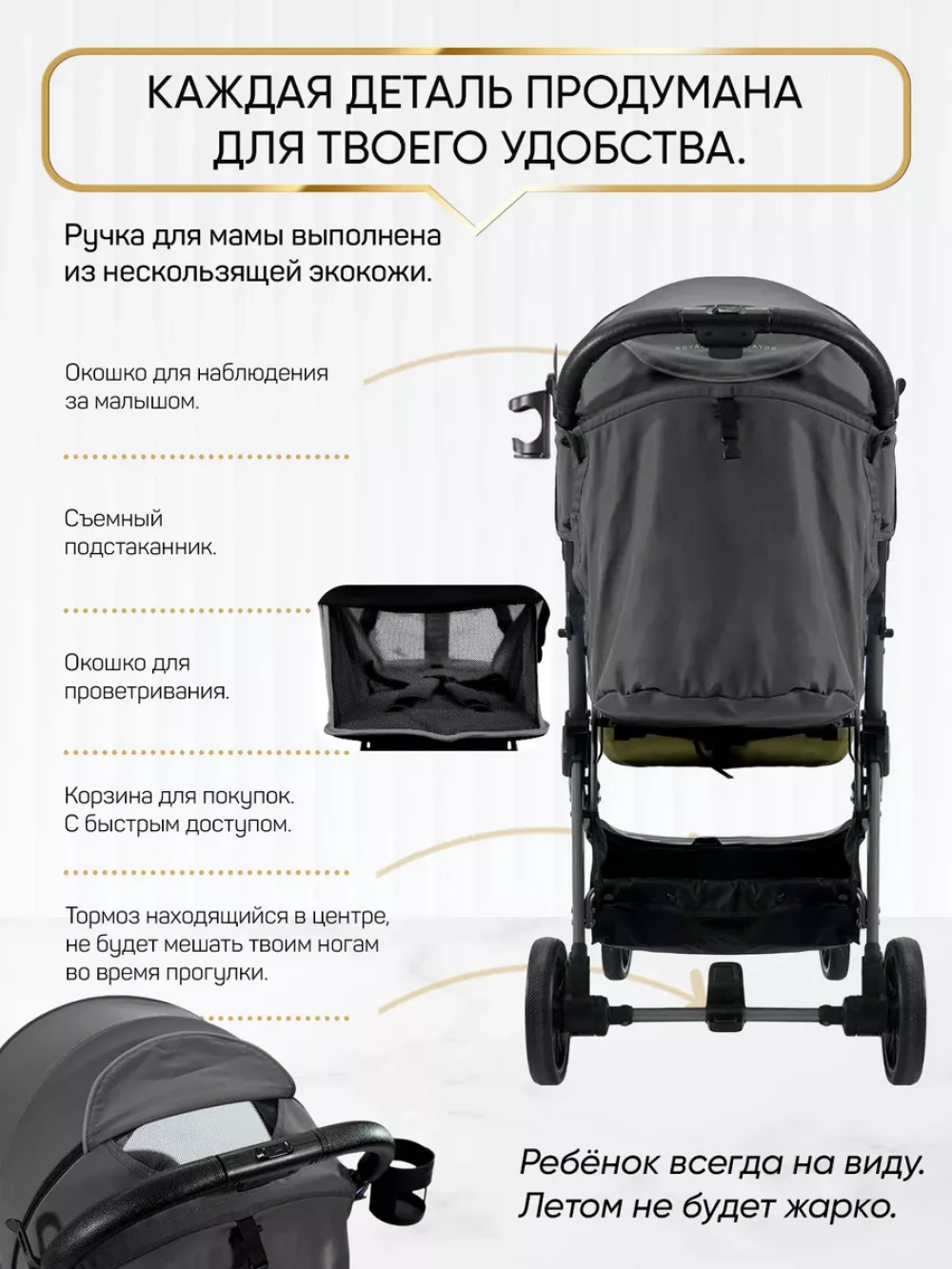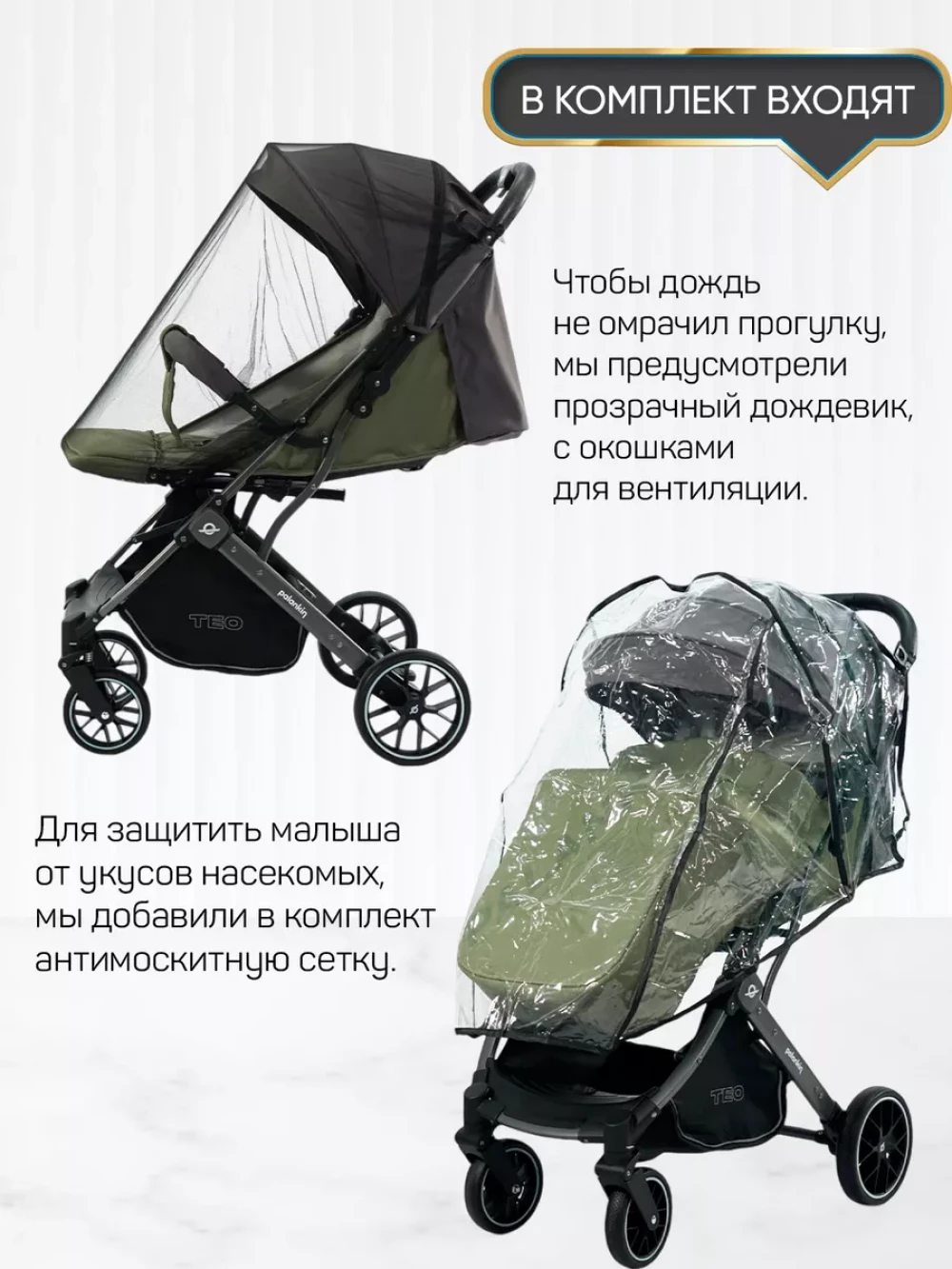 утепленная накидка на ножки; съемный подстаканник; вместительная корзина для покупок; москитная сетка; дождевик; чехол для транспортировки
