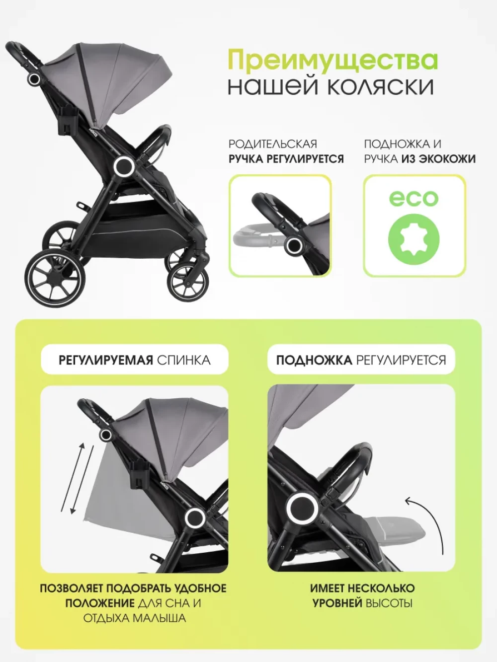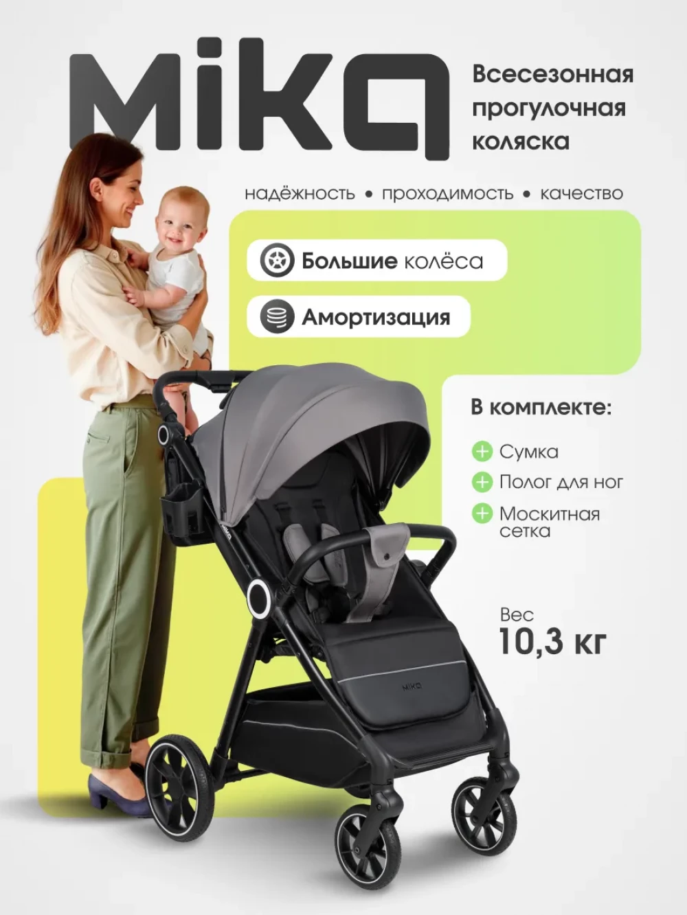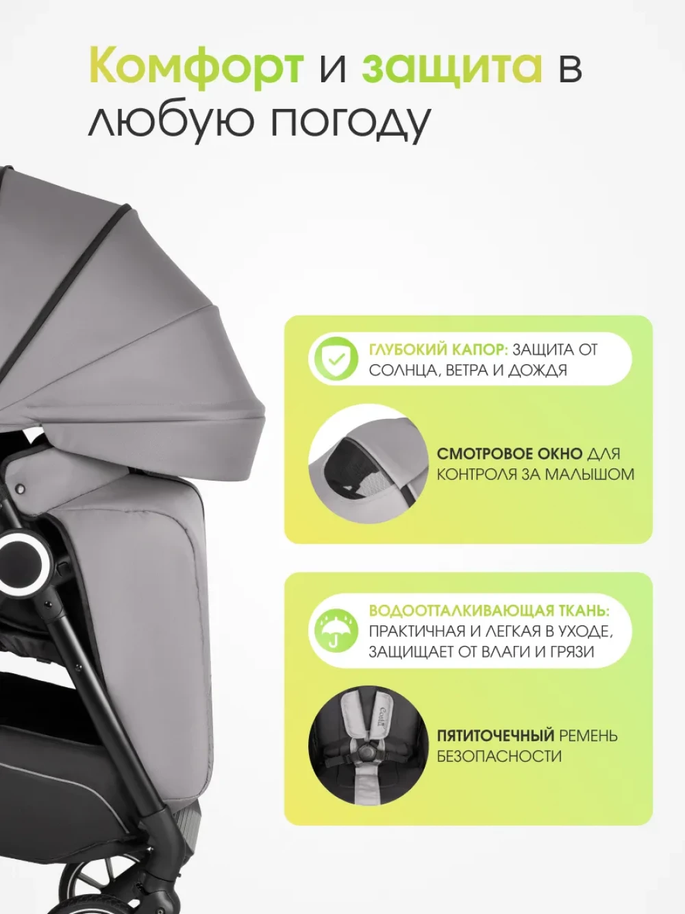 амортизация; регулировка высоты ручки; с большим капюшоном
